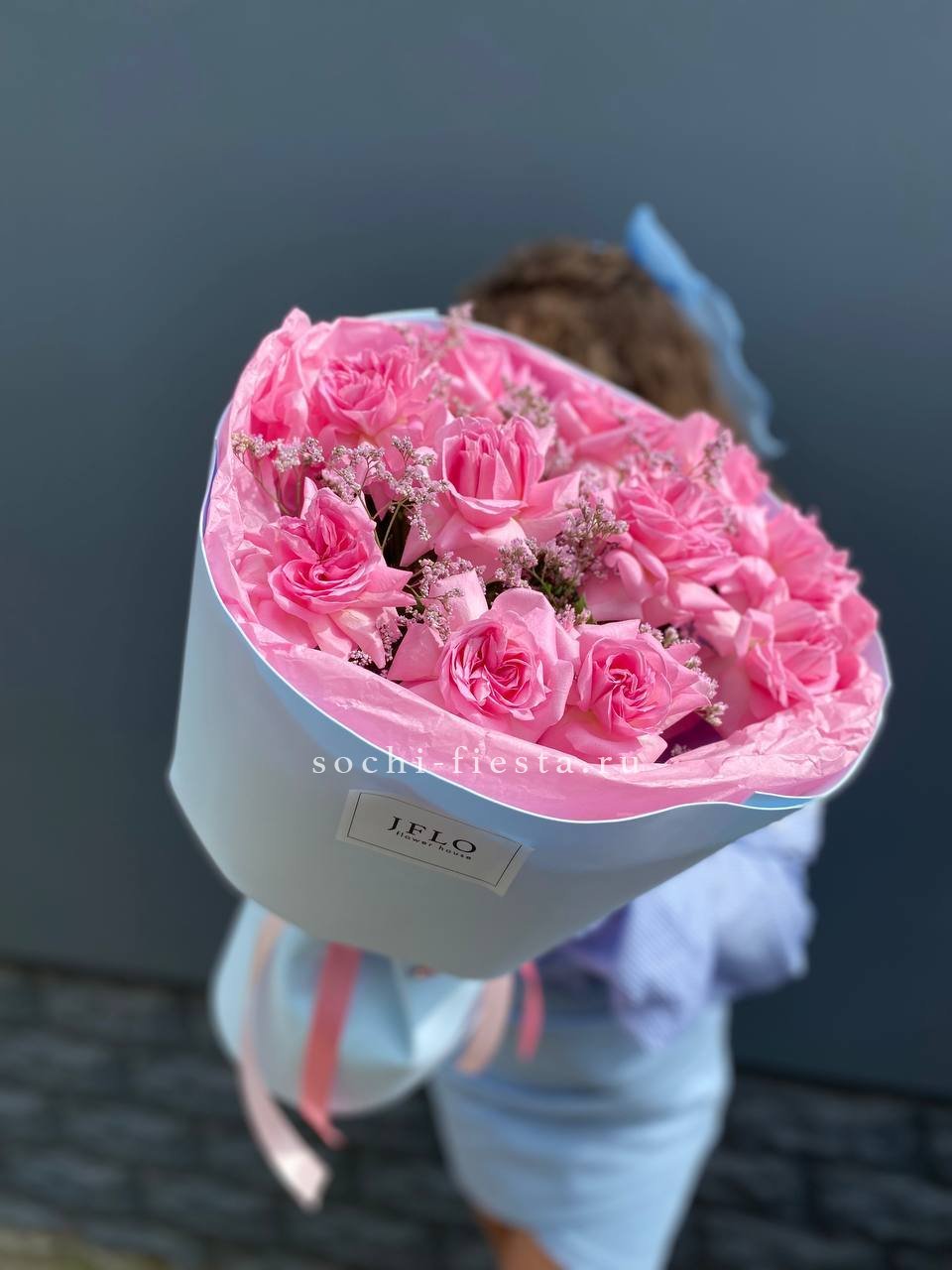 Французские розы распускаются мягкими облаками пудрового оттенка. Лимониум добавляет воздушности, а эвкалипт создает свежую основу. Букет собран так, что каждый бутон виден и дышит.