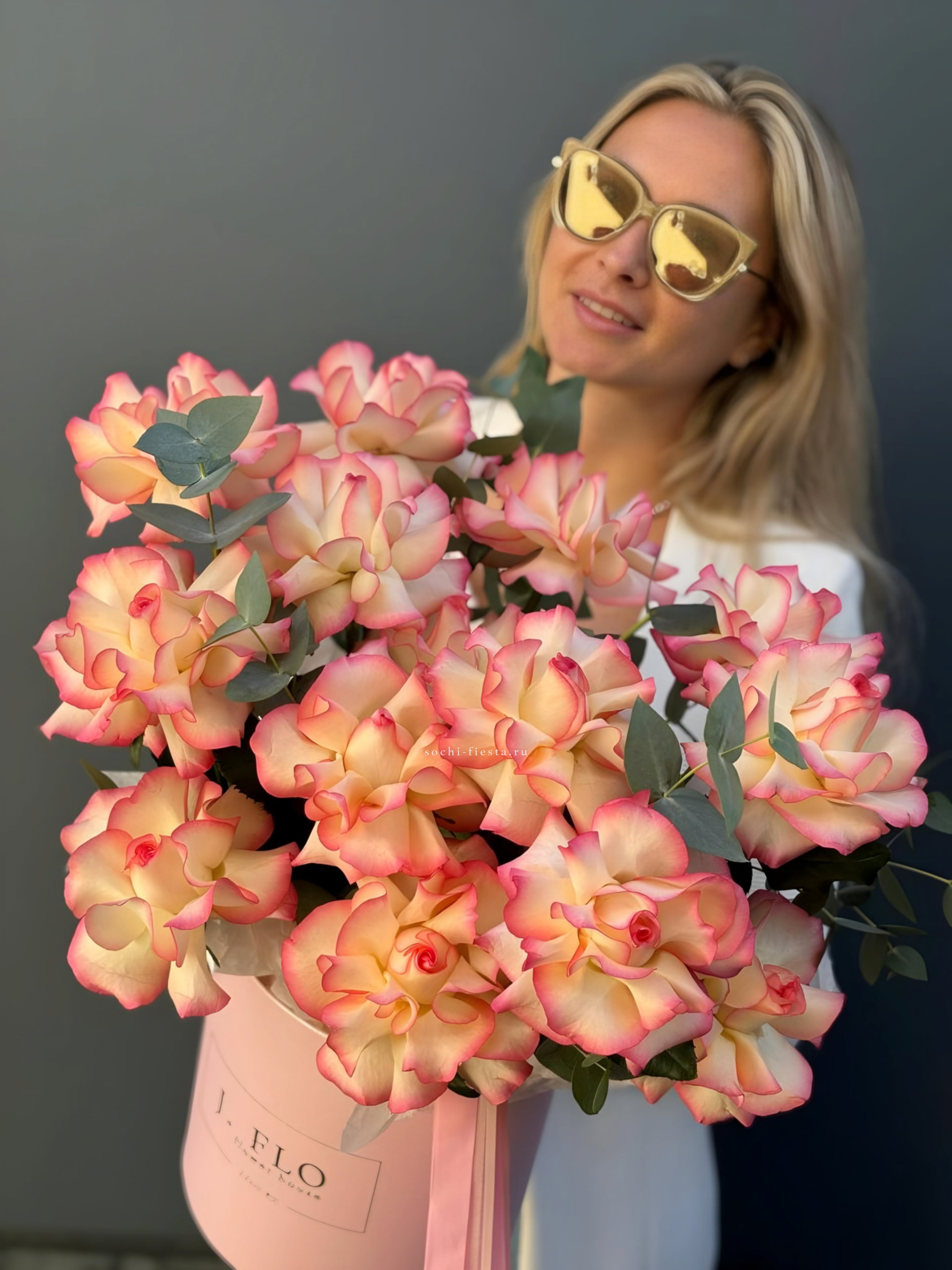 вывернутые розы Джумилия, цилиндр D20, эвкалипт, лента, упаковка.