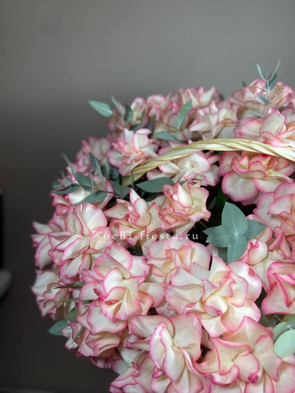 Пятьдесят один цветок в плетеной корзине дополнен серебристым эвкалиптом. Ветки зелени обрамляют каждый бутон и добавляют воздуха между головками роз. Устойчивая форма удобна для размещения на столе.