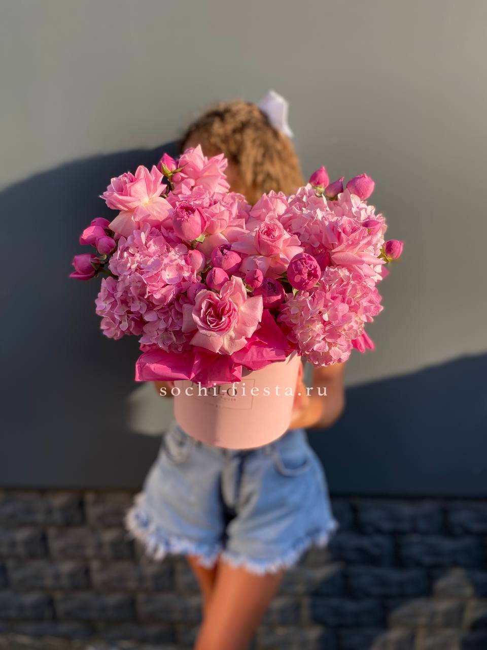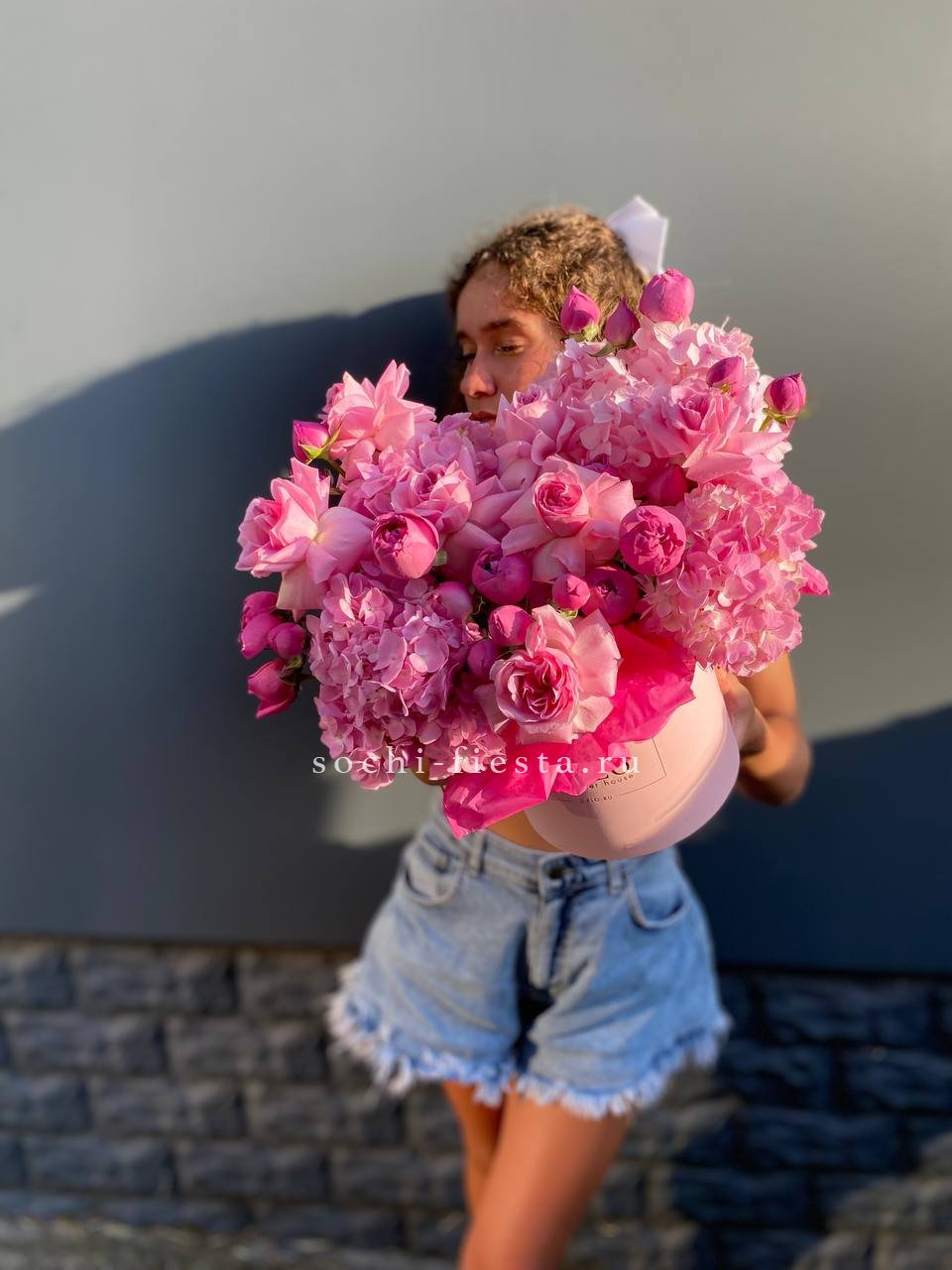 гортензия, вывернутые розы, диантус, кустовая роза, диантусы, оформление в боксе.