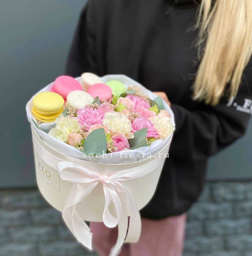 Пудровые розы и кустовые соцветия собраны с диантусами и озотамнусом в округлую форму. Шесть макаронс завершают композицию и создают ощущение домашнего уюта.