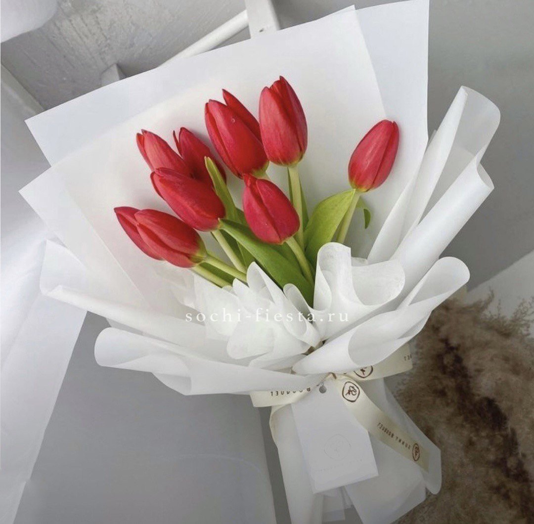Девять красных тюльпанов в аккуратной связке. Яркие упругие бутоны на крепких стеблях держат форму и добавляют цвета в весенний день.