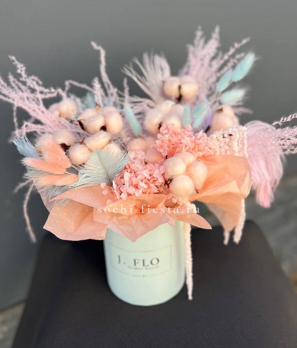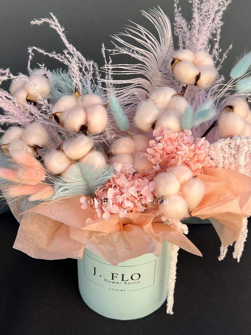 гортензия, хризантема, белая роза, гербера, статица, хлопок, упаковка.
