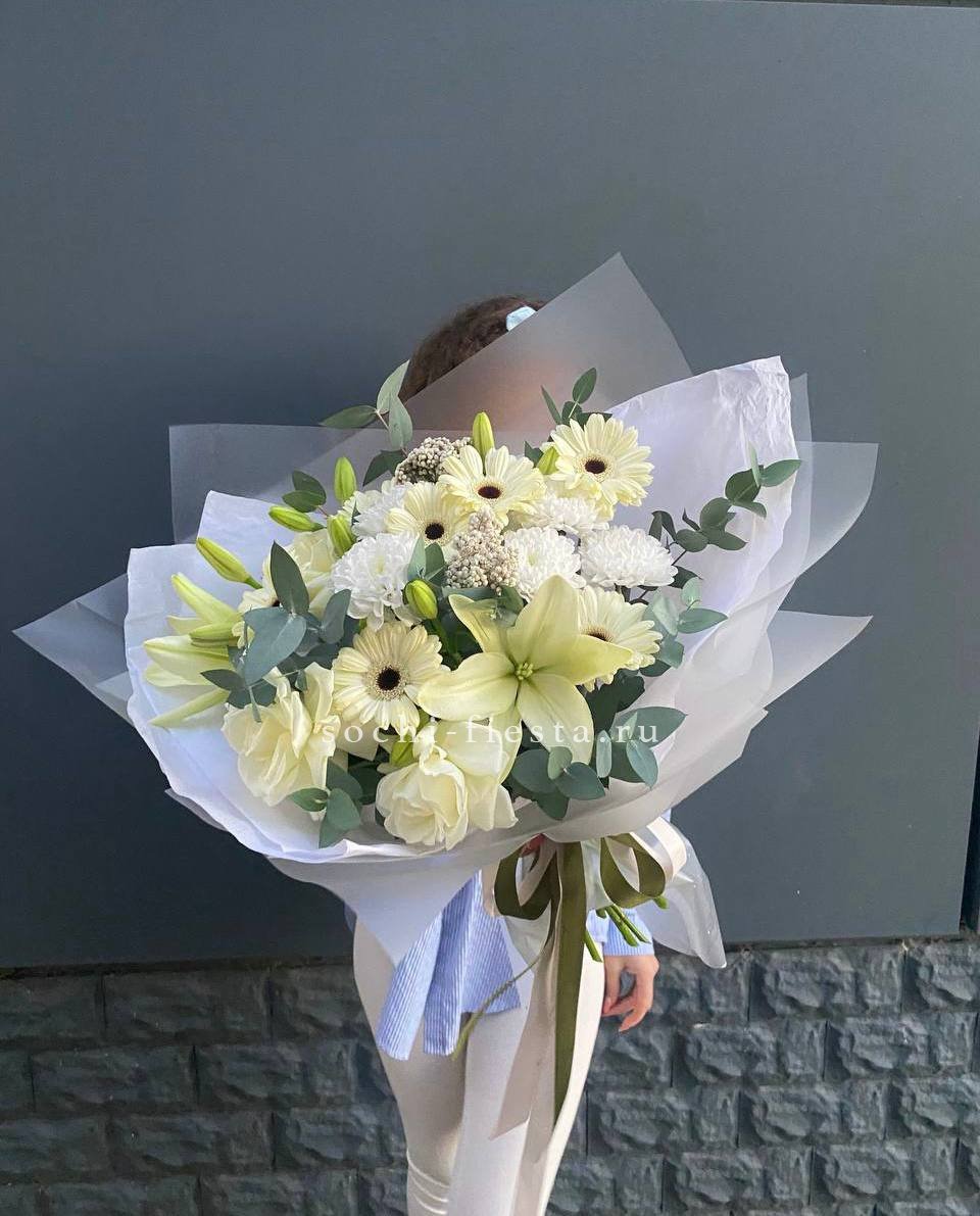 Яркие герберы и белоснежные лилии создают жизнерадостную композицию с чистым силуэтом. Озотамнус добавляет воздушности, а розы завершают образ свежестью и лёгкостью.