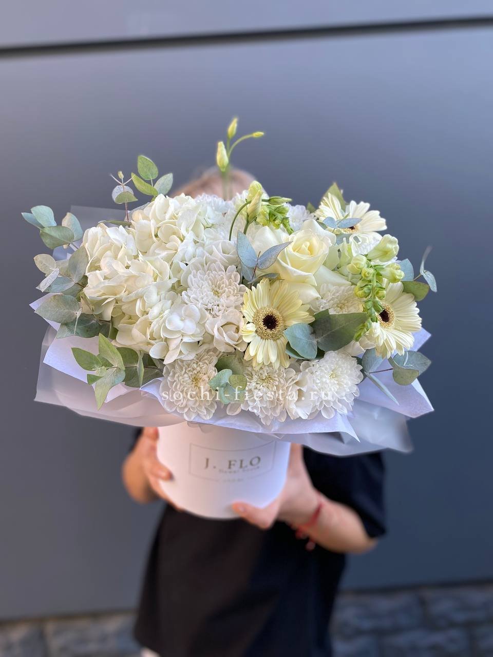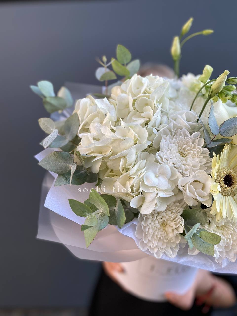 пионовидная роза, хамелациум (замена в несезон), эвкалипт, авторское оформление.