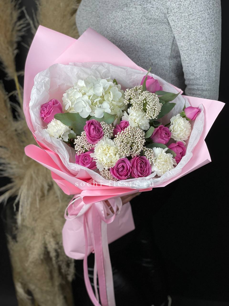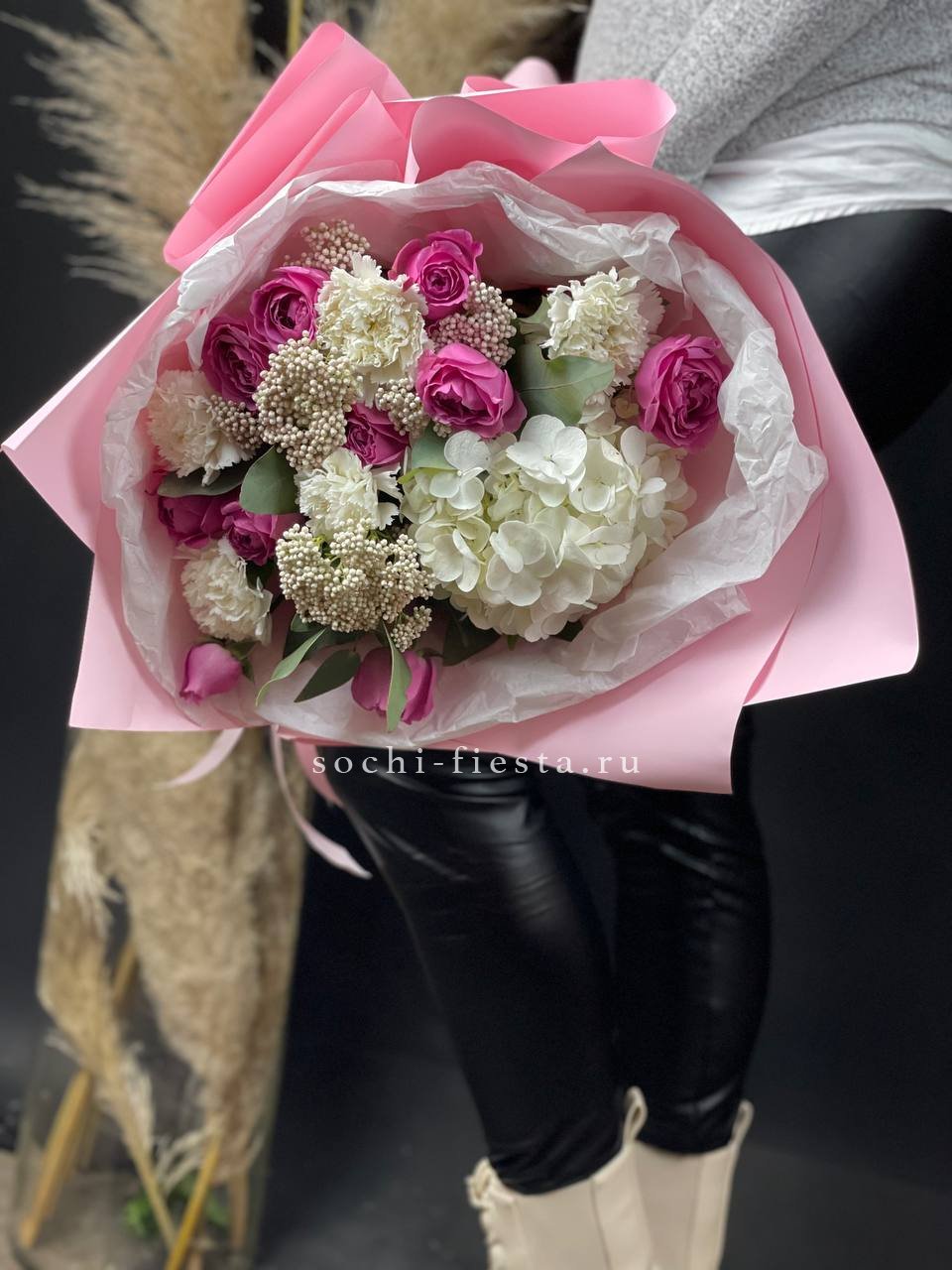 гортензия, озотамнус (или аналог сезона), мисти бабблс, диантус, авторское оформление.