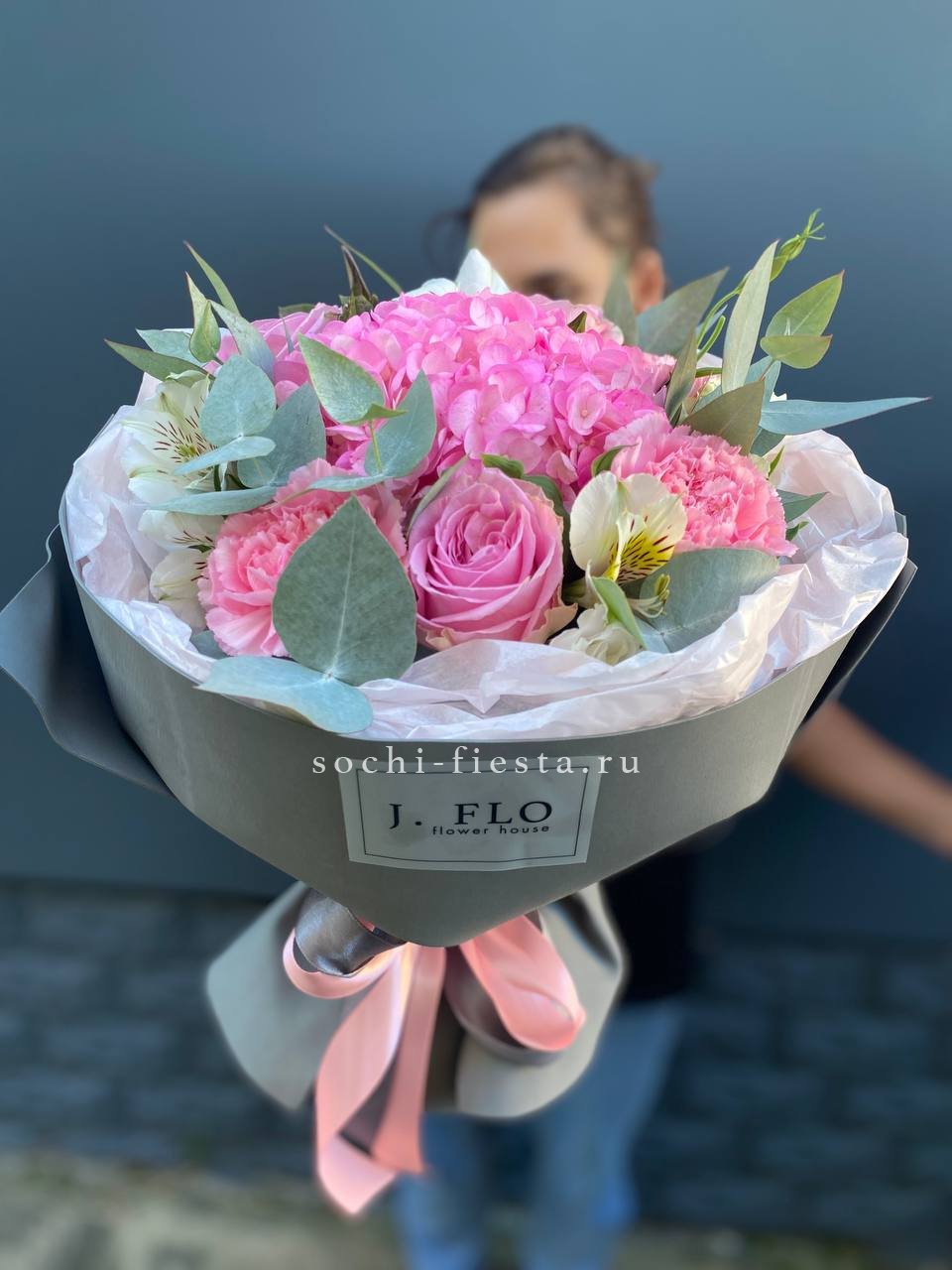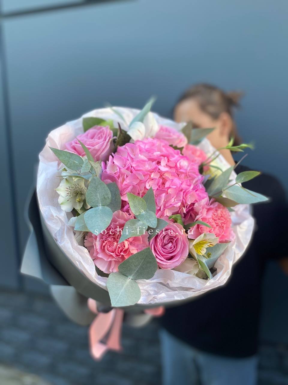 Розовая гортензия и эустома раскрывают свою красоту в каждом лепестке. Мягкие оттенки переходят один в другой, создавая спокойное и гармоничное впечатление.