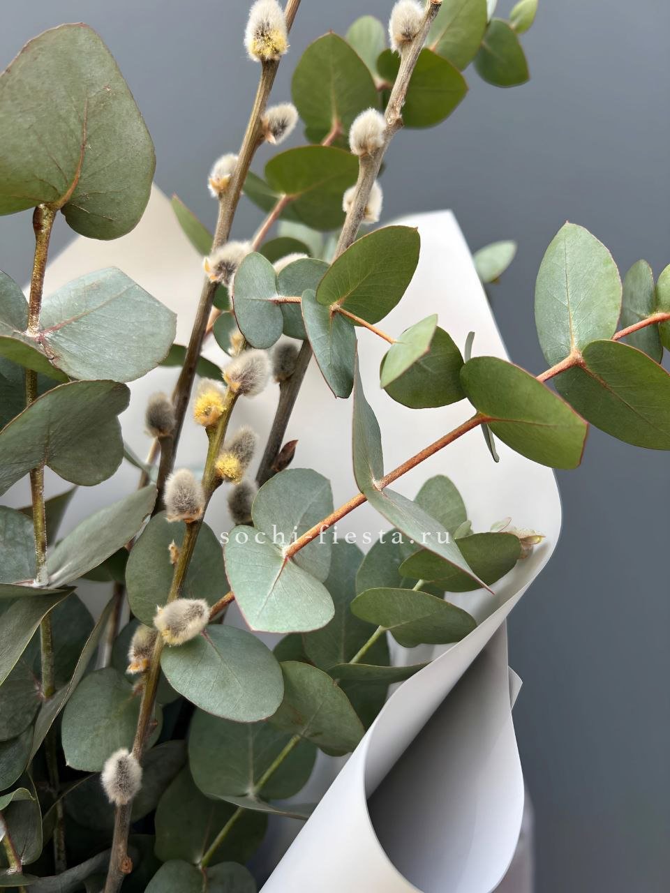 Гортензия создаёт воздушную базу, а герберы добавляют яркие точки цвета. Эвкалипт заполняет пространство между бутонами и придаёт композиции завершённость. Букет выглядит свежо и легко.