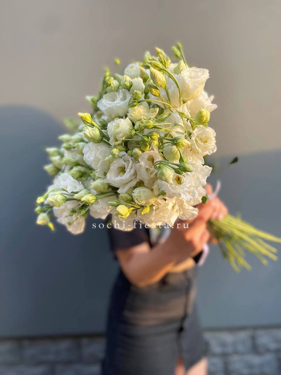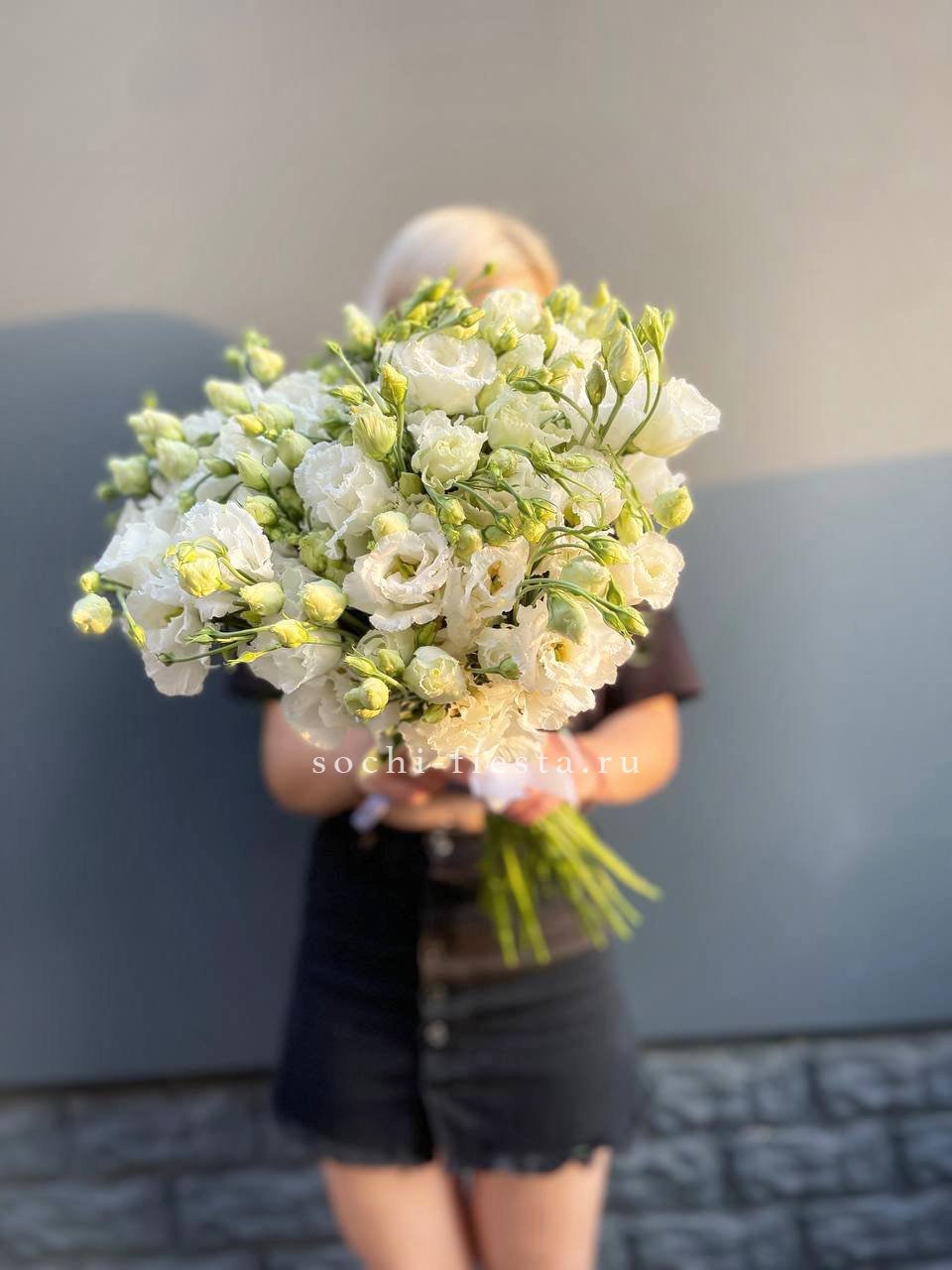 Сто один стебель белоснежной эустомы с многоярусными бутонами собраны в воздушный букет. Каждый цветок напоминает миниатюрную розу и вместе они образуют лёгкую скульптурную форму.