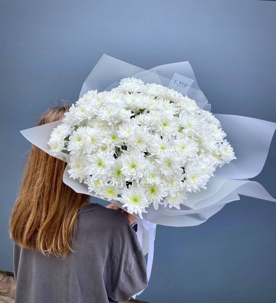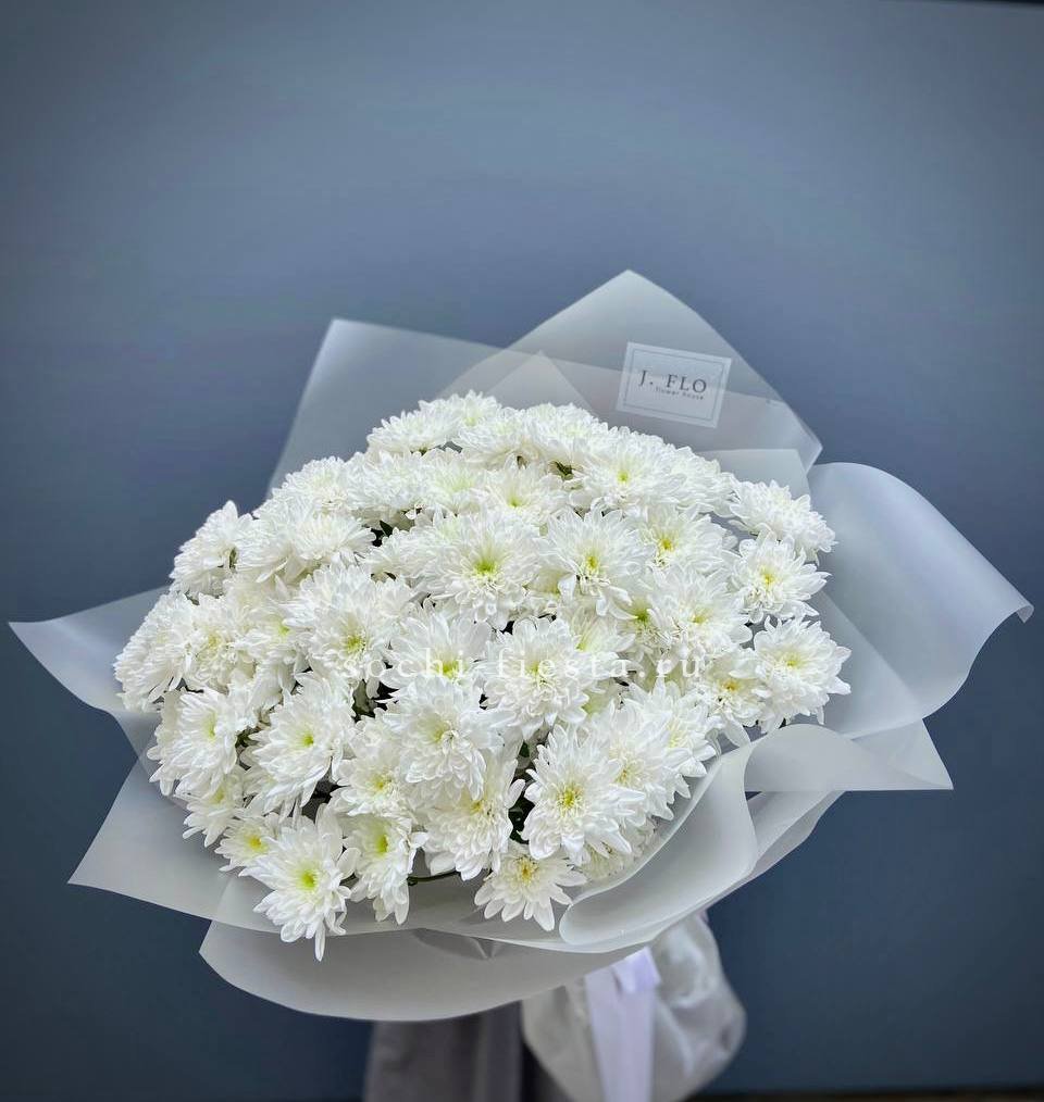 Девятнадцать веток белоснежных хризантем собраны в плотный купол. Множество мелких соцветий создают объёмную текстуру, словно морозный узор. Монохром в чистом виде для минималистичного интерьера.