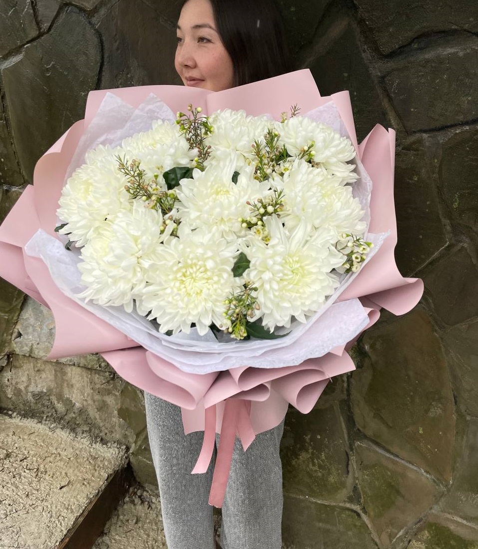 хризантема одноголовая - 9 шт., лента, дизайнерская упаковка.