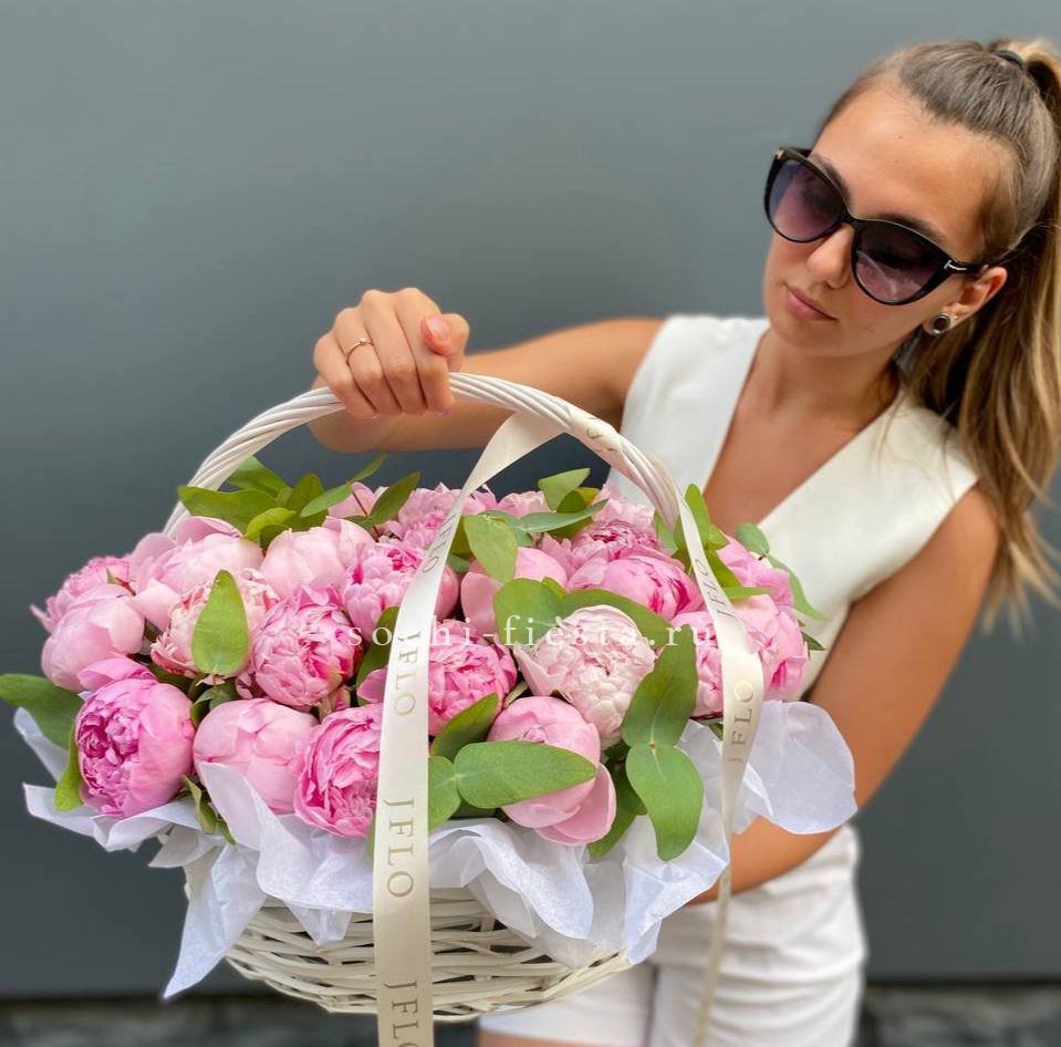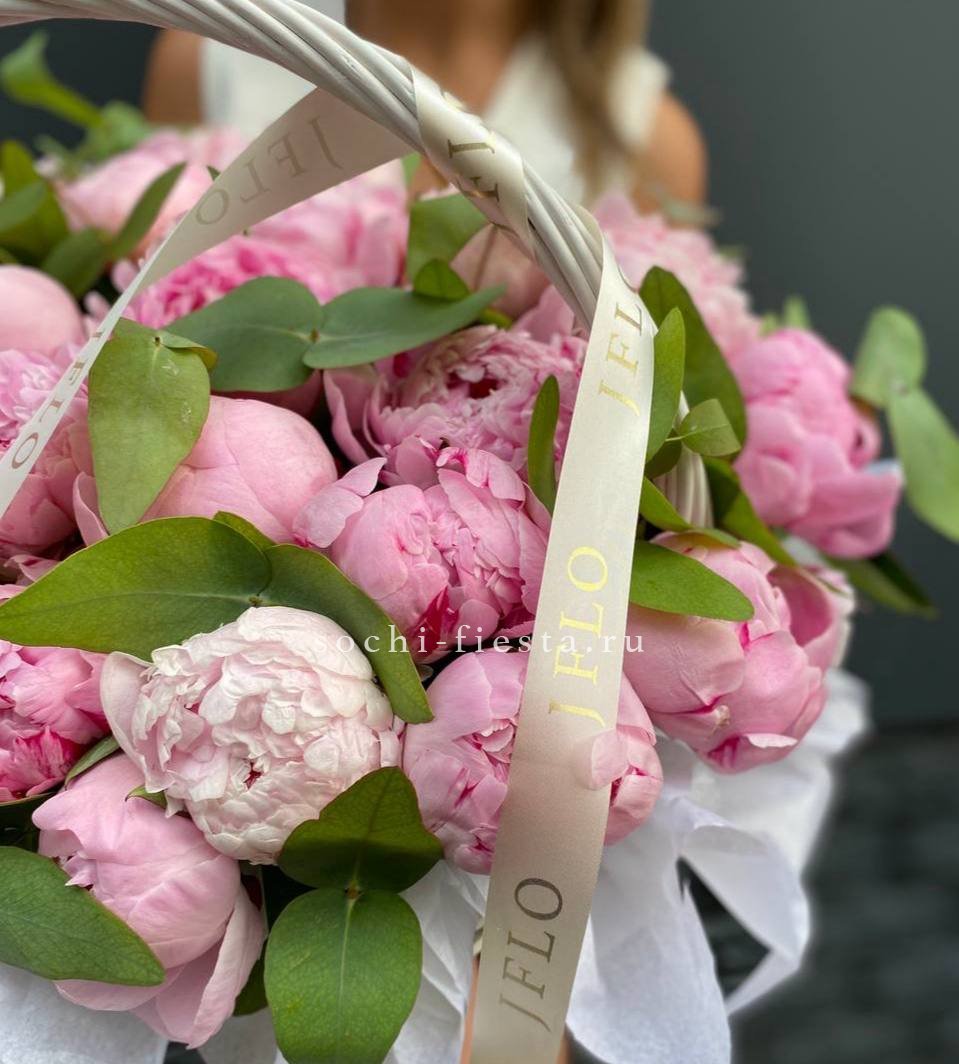 Двадцать девять пионов с ветками эвкалипта собраны в классическую корзину. Бутоны разной степени раскрытия формируют воздушный купол, который сохраняет свежесть и аккуратный силуэт несколько дней.
