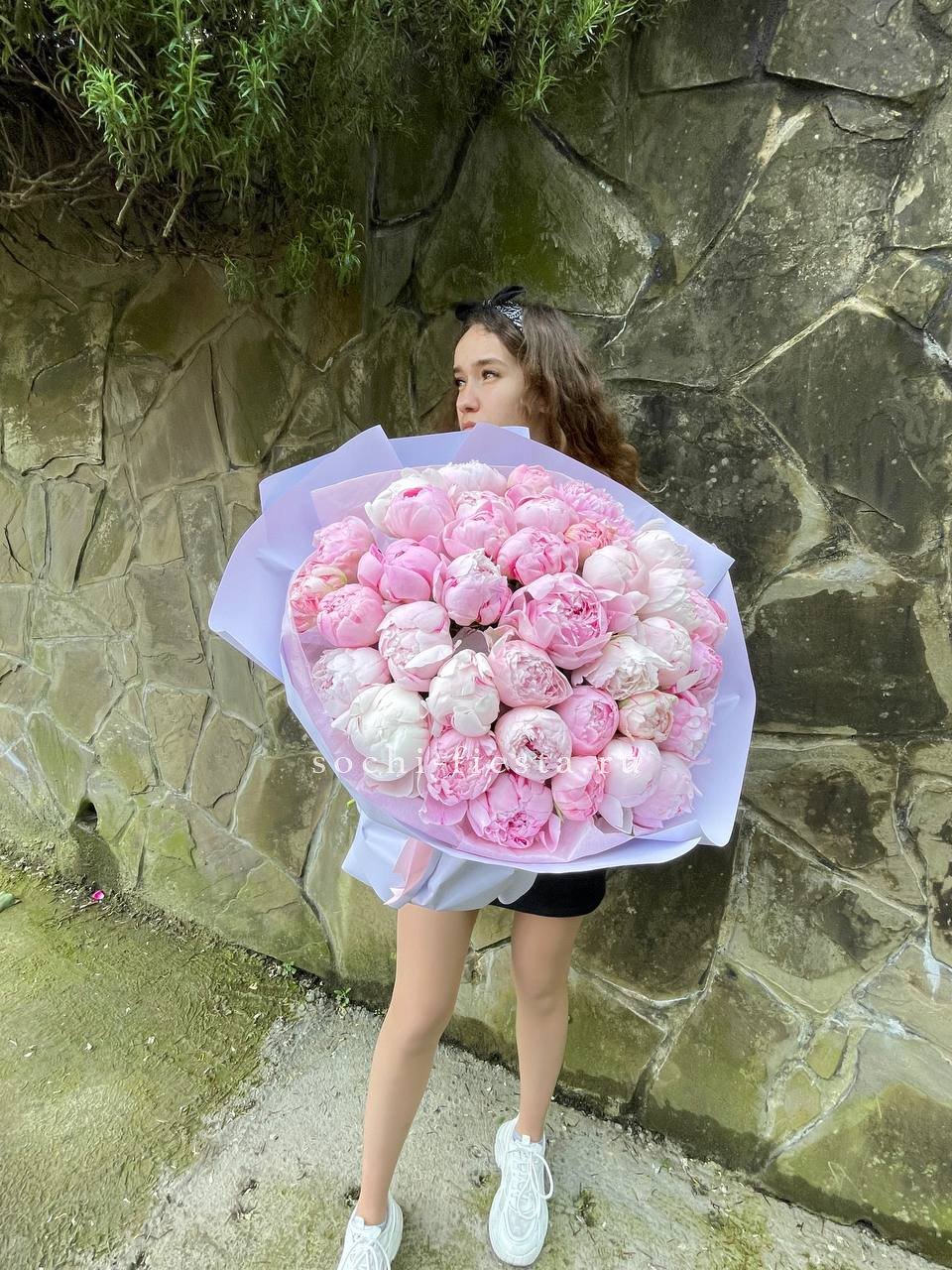 Тридцать девять пионов создают объёмную композицию с выразительным присутствием. Комбинированная упаковка поддерживает структуру и добавляет визуальной глубины. Впечатляющий масштаб для пространства.