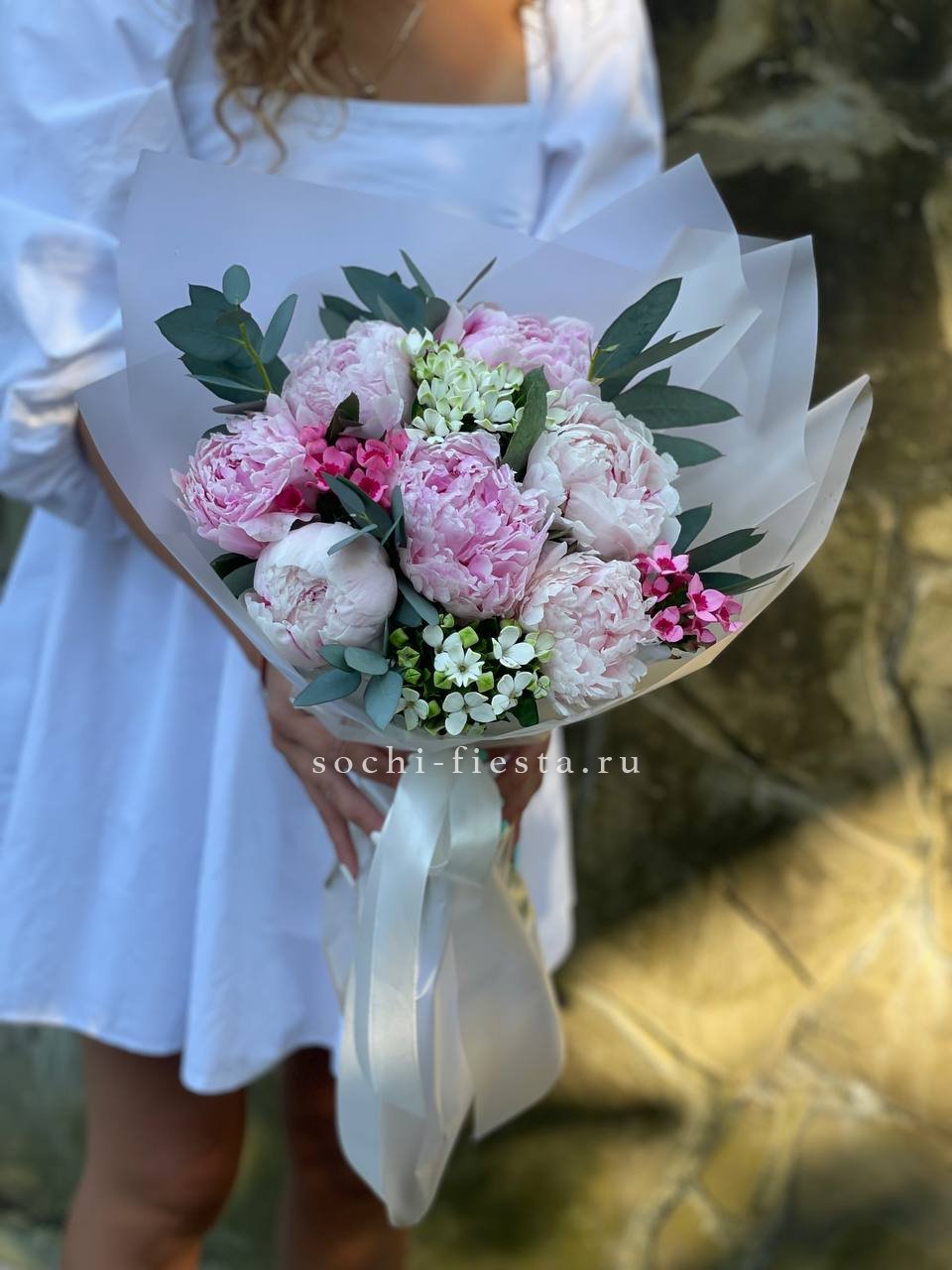 7 розовых пионов сорта Сара бернар, эвкалипт, бувардия (замена вне сезона) лента, оформление.