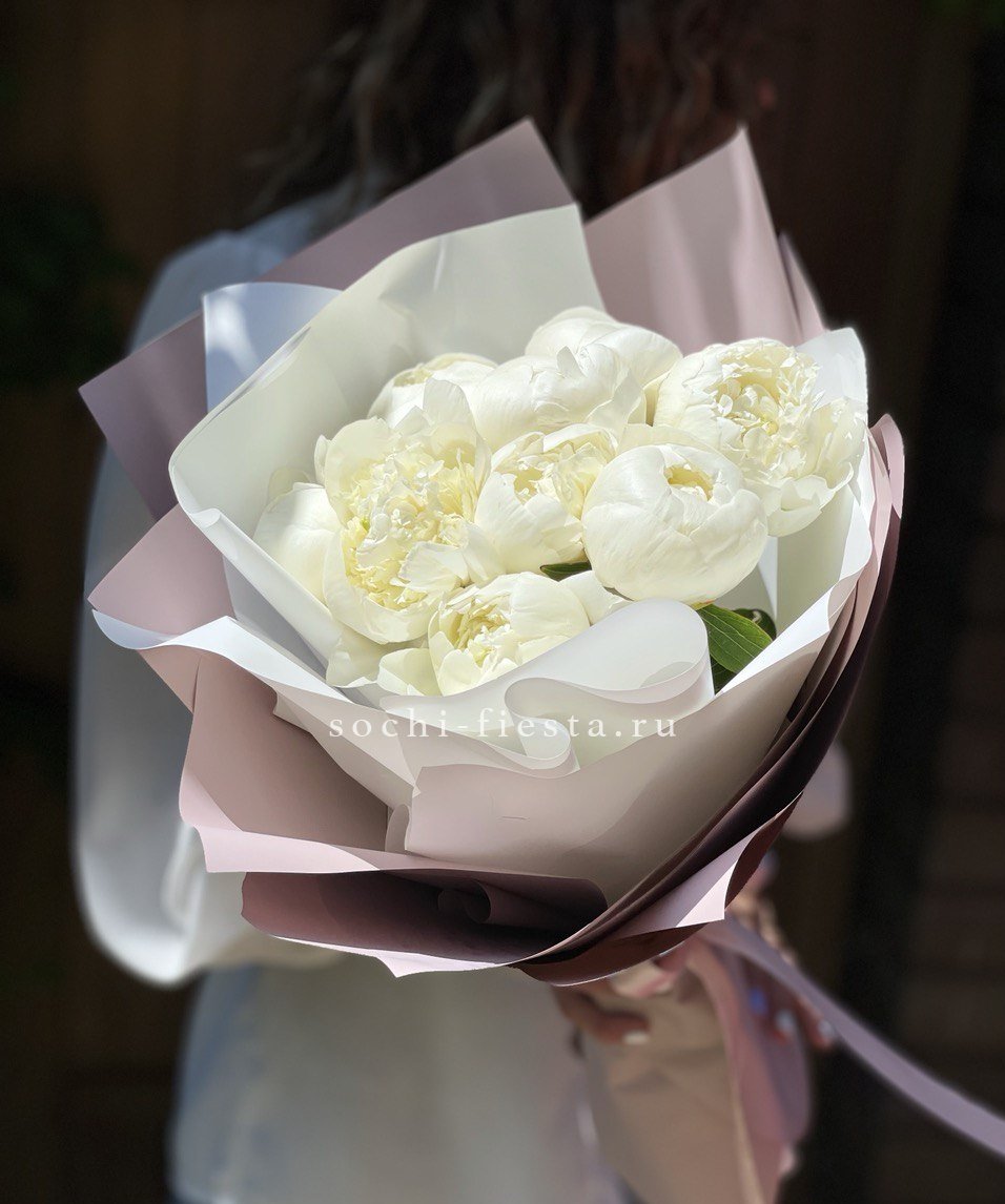 белые пионы, лента, дизайнерская упаковка.