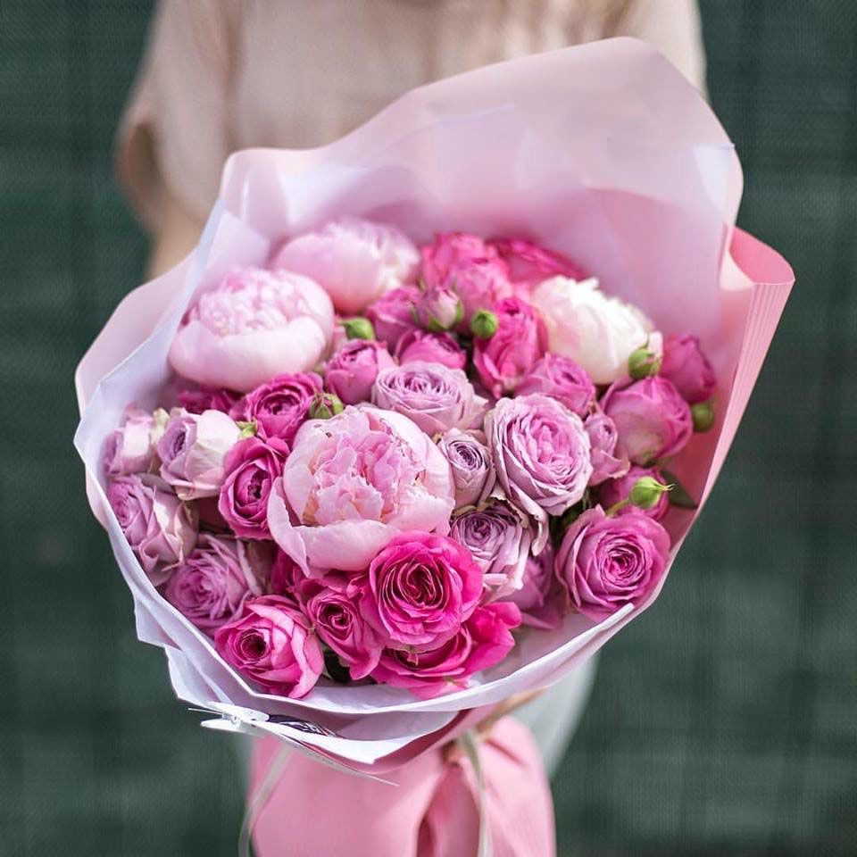 пионы, кустовые розы, лента, дизайнерская упаковка.