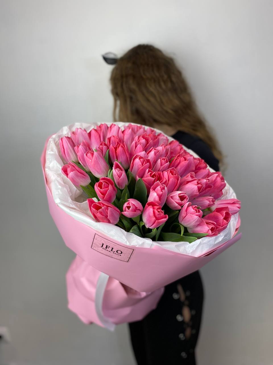 Сто один бутон собран в плотную охапку, где каждый стебель держит линию и создаёт объём. Красные головки тюльпанов образуют живую волну, которая заполняет пространство цветом и движением. Такая композиция говорит сама за себя.