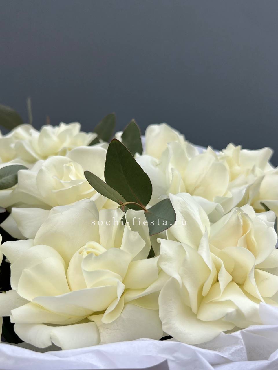 Пышные шапки гортензии создают объёмную основу, сквозь которую проступают розы и герберы. Букет плотно собран, каждый цветок находит своё место в общей структуре. Эвкалипт добавляет воздушности по краям композиции.
