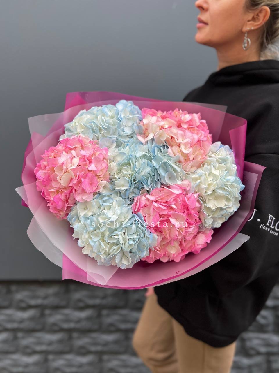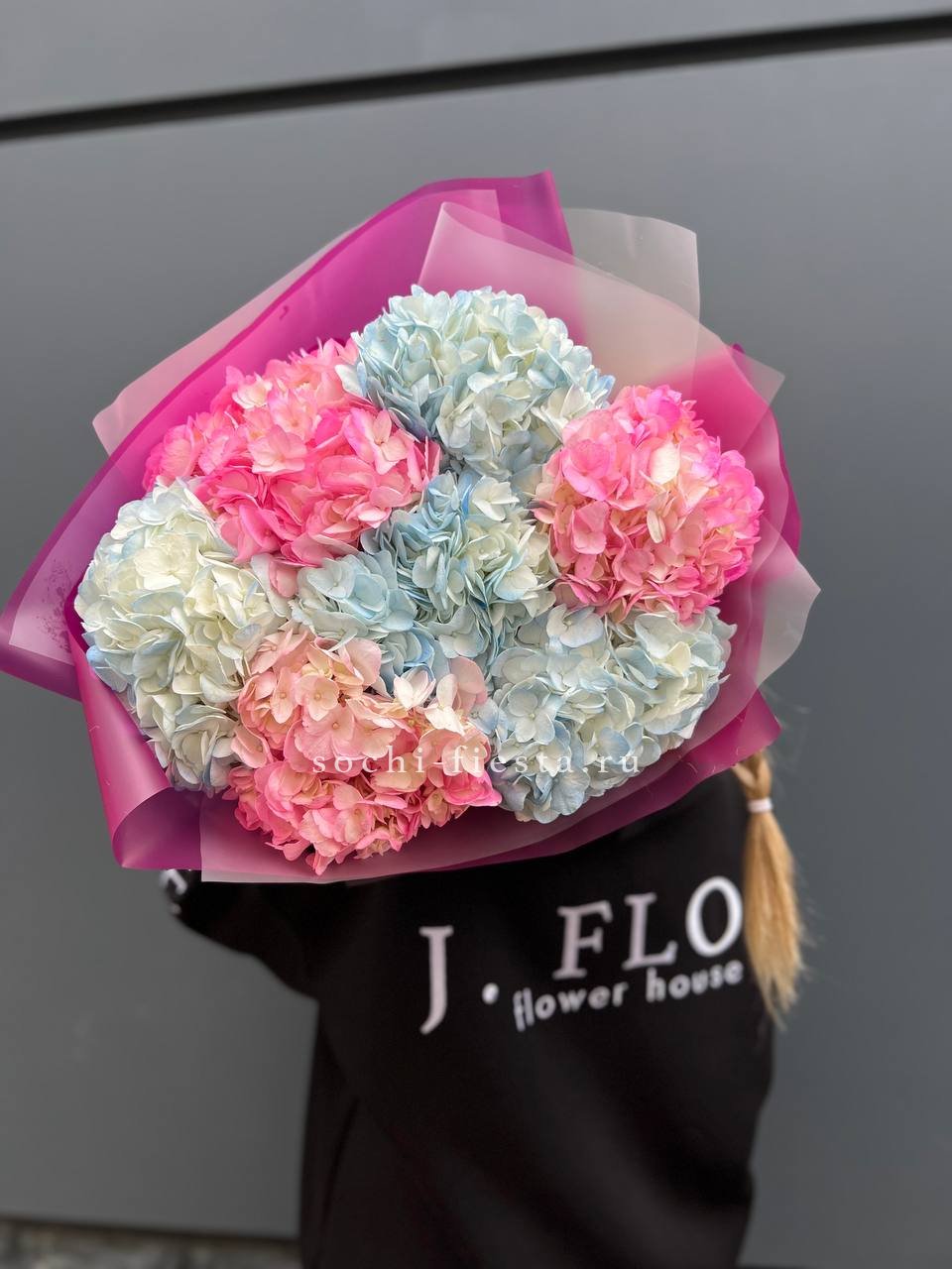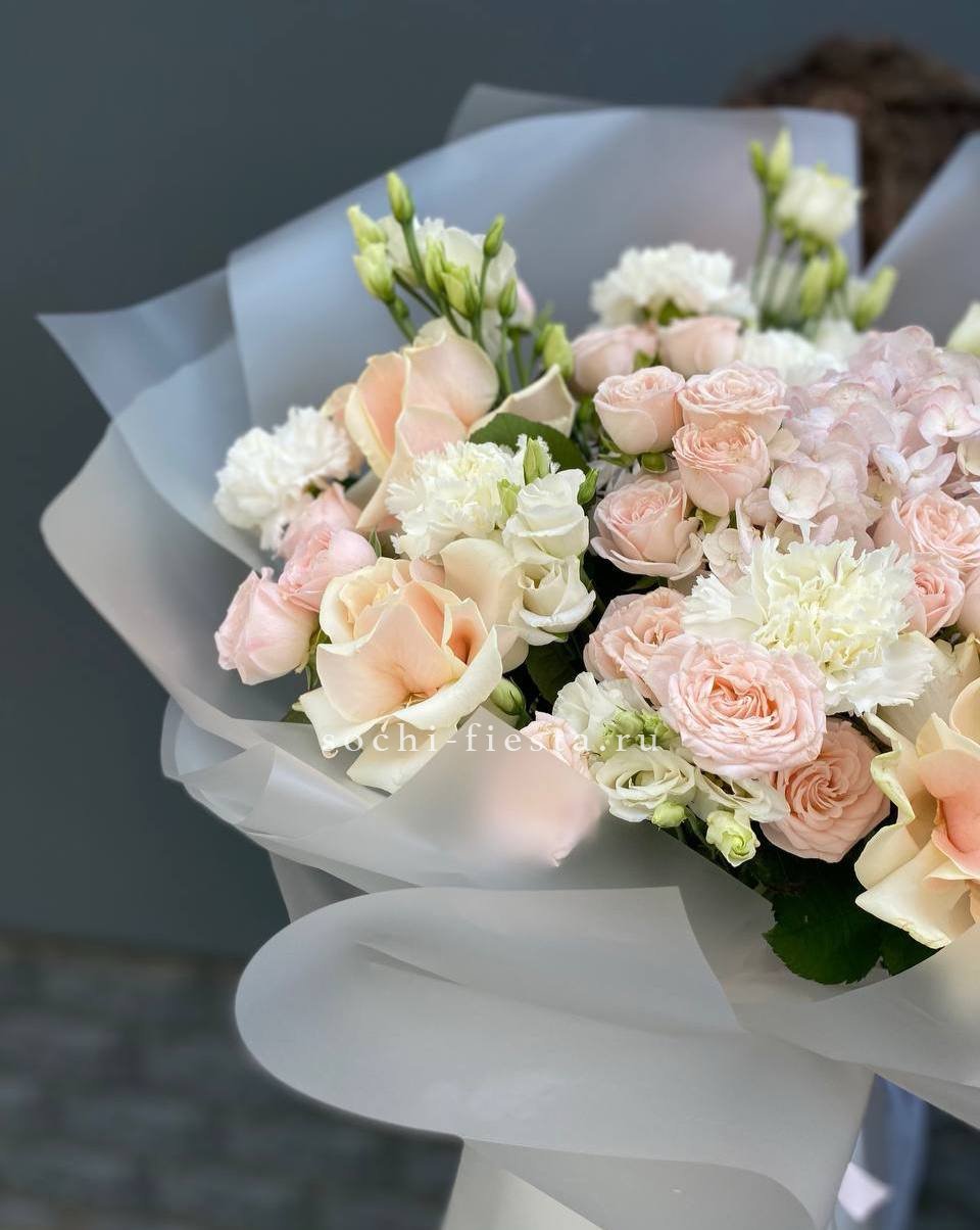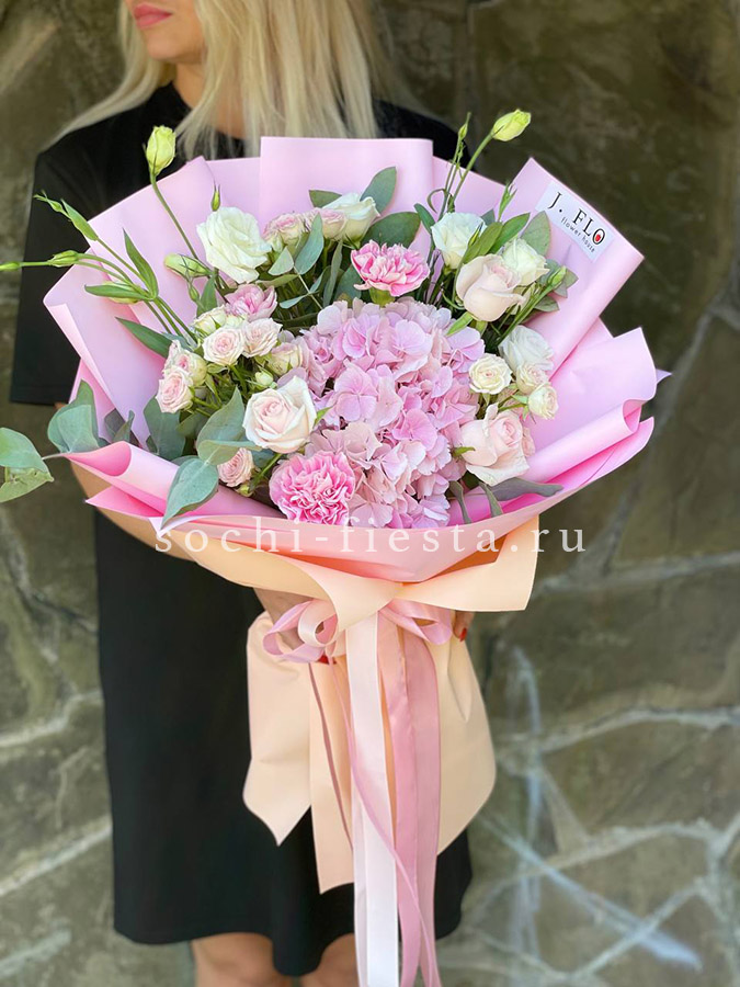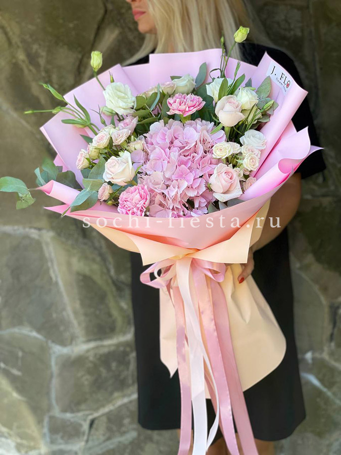 гортензия, диантус, роза, кустовая роза, эустома, эвкалипт, лента, авторская упаковка.