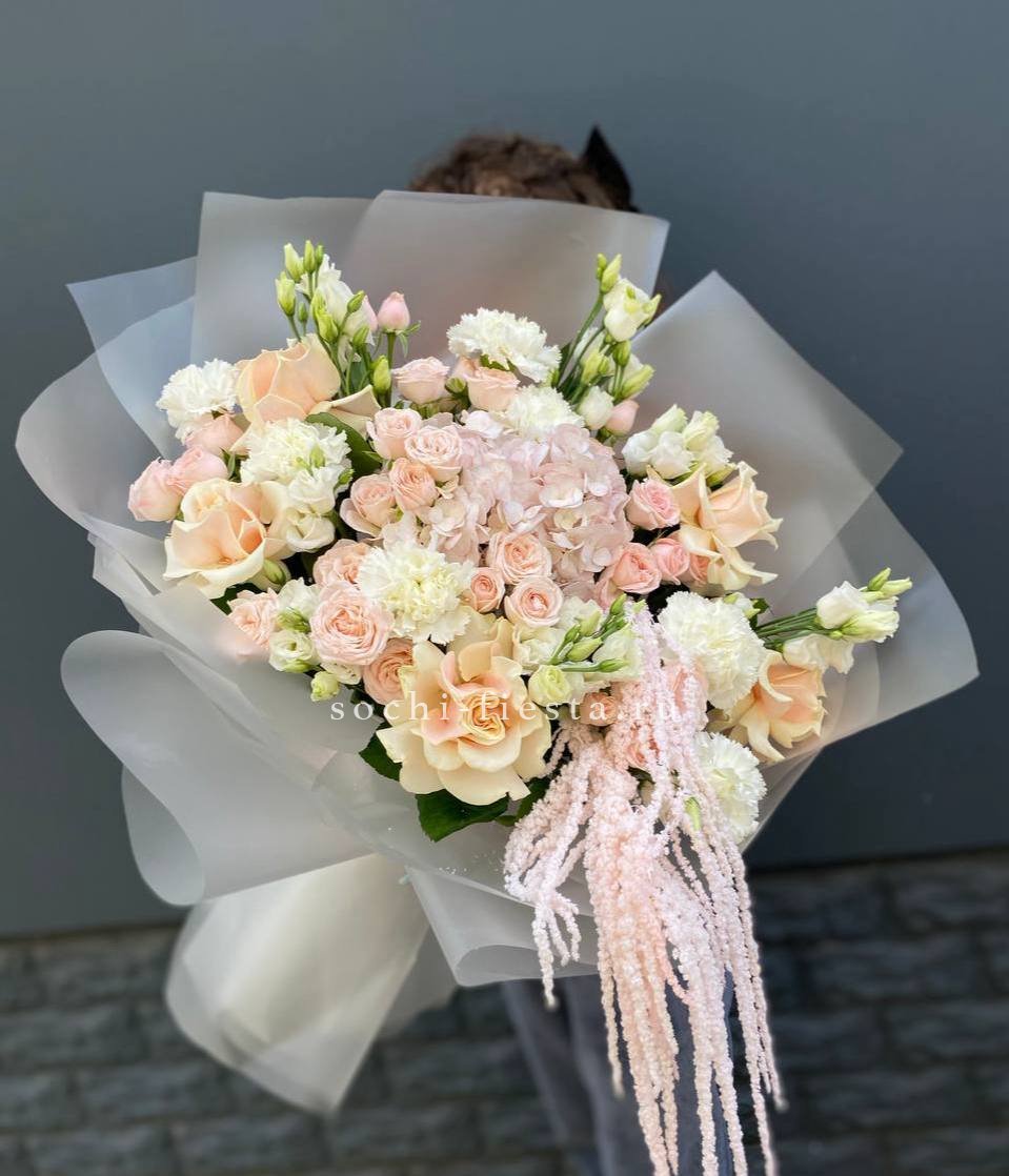 Кремовая палитра с переходами от молочного до сливочного оттенка объединяет розы, эустому и пушистую гортензию. Букет выглядит цельно и мягко, словно утренний свет на лепестках.