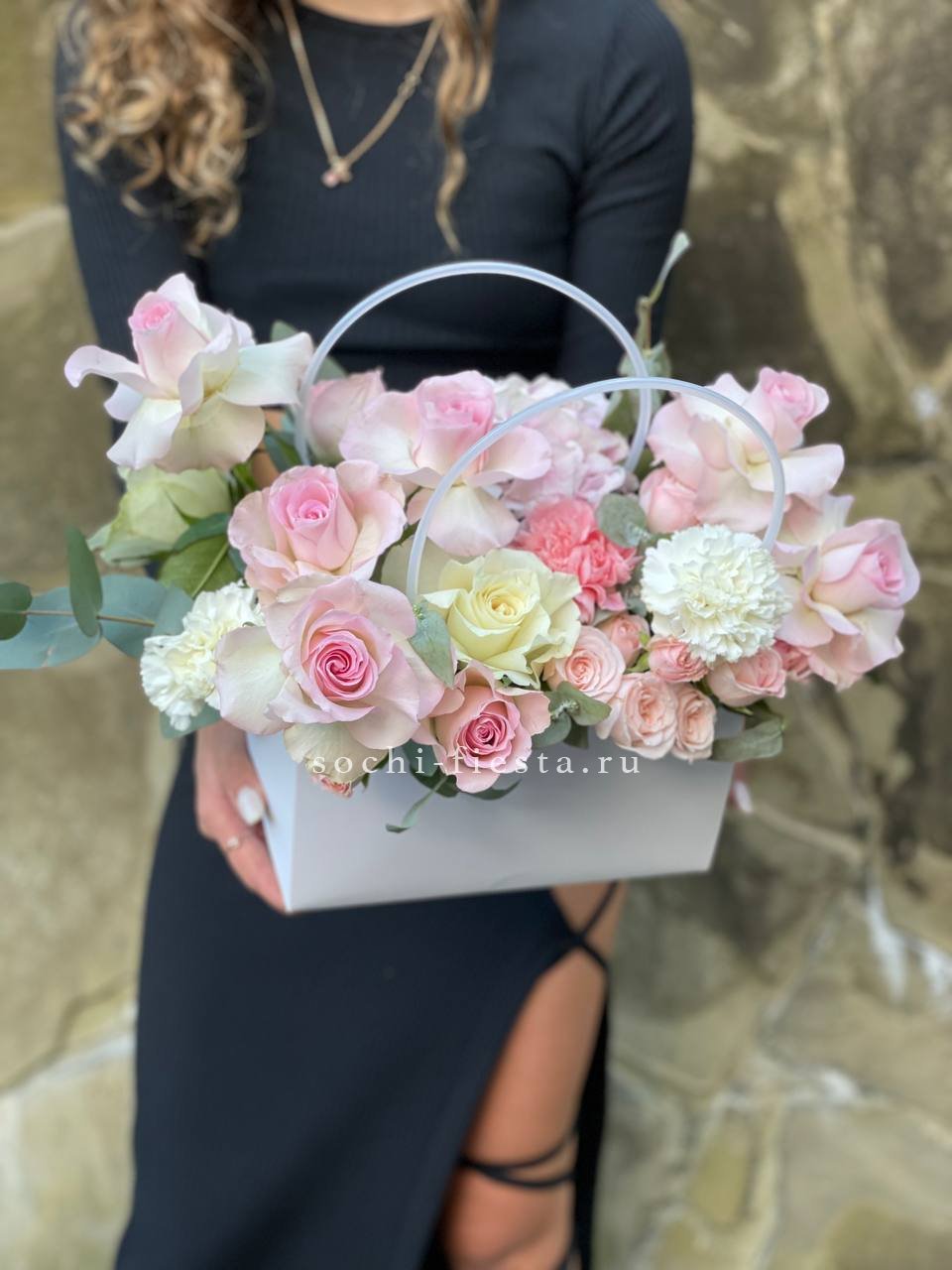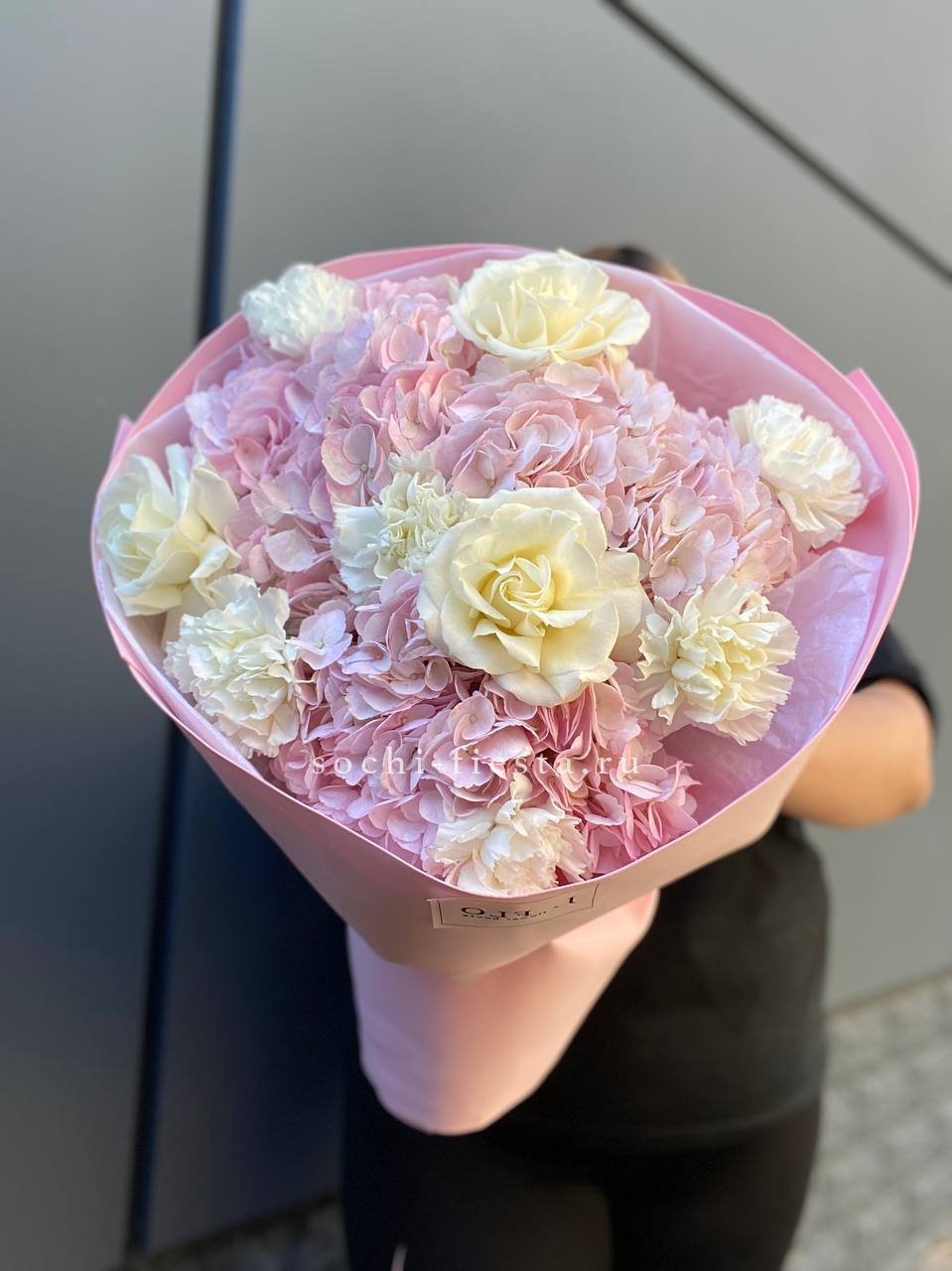 Плотная сборка с открытыми бутонами роз и воздушными соцветиями гортензии создаёт многослойную композицию. Белые каллы и маттиола добавляют вертикальные линии, а эвкалипт смягчает переходы между крупными формами.