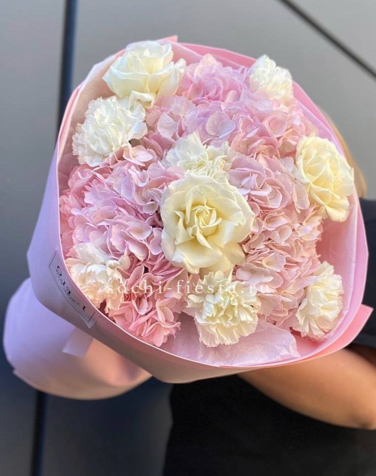 гортензия, эустома, кустовая роза, маттиола (или львиный зев), роза одноголовая, каллы (или аналог), эвкалипт, лента, упаковкаСостав букета в несозон может нести незначительные изменения.