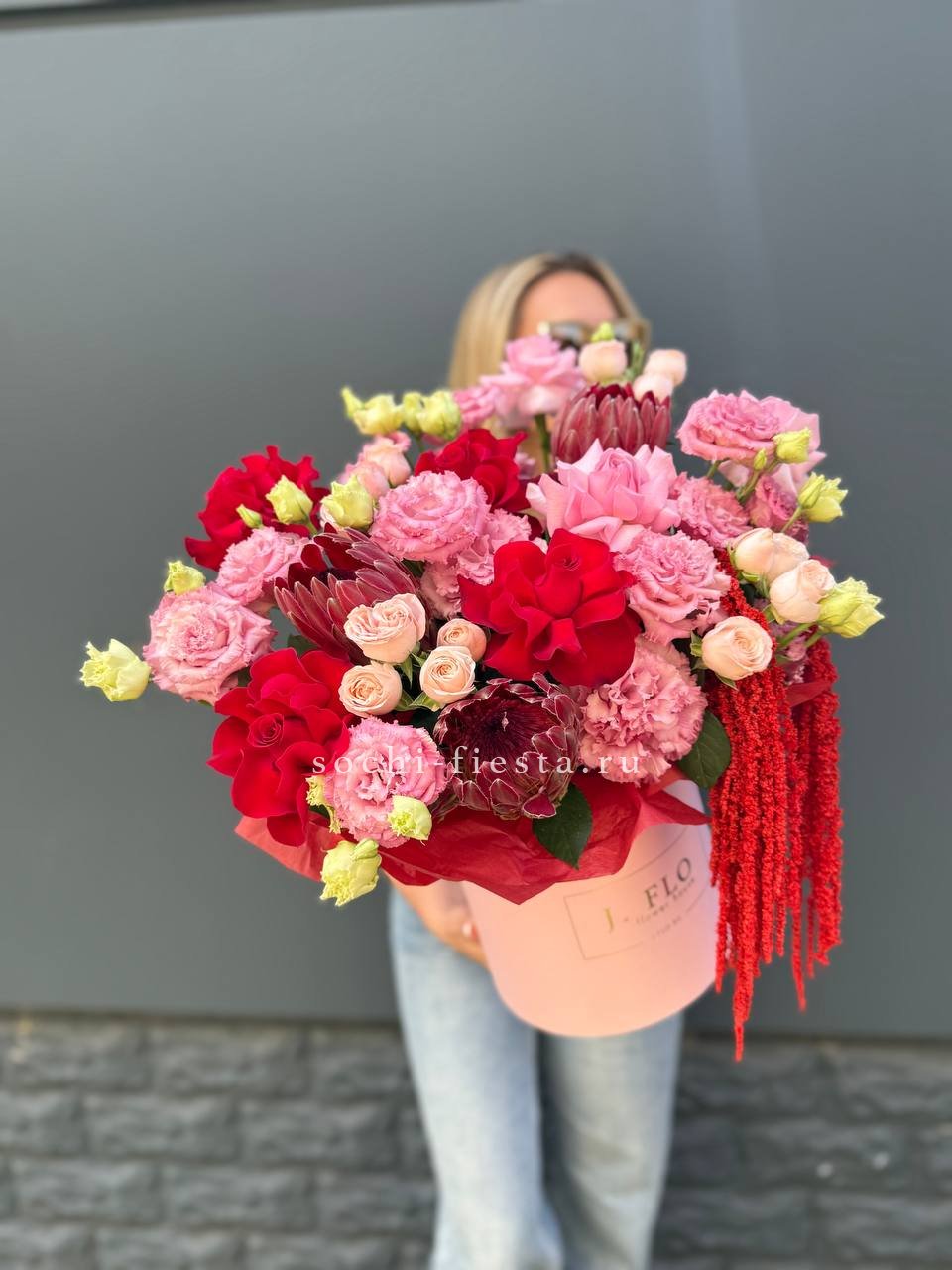 Протея с её графичными соцветиями задаёт ритм всей композиции. Амарант свисает мягкими нитями, эустома добавляет воздуха, а кустовые розы собирают форму в плотный цилиндр.