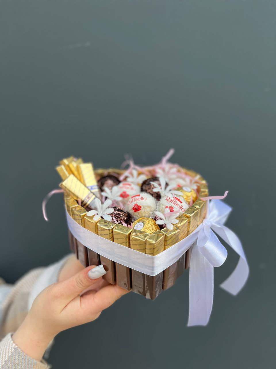 В коробке-сердце собраны конфеты Merci, Ferrero Rocher и Raffaello с декоративными цветами. Сочетание разных текстур шоколада и фундука создает многослойное впечатление от подарка.