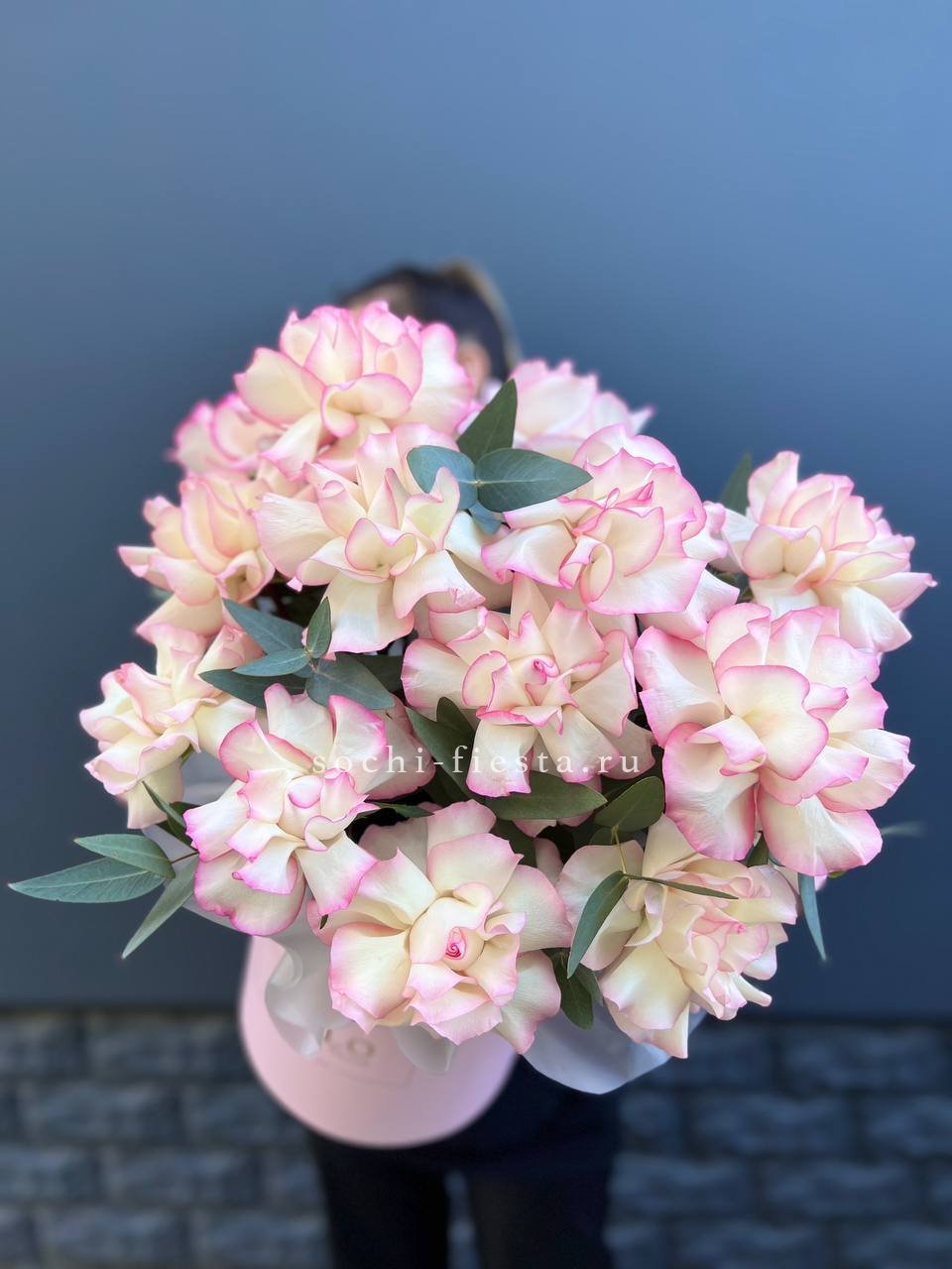 вывернутые  розы Джумилия, цилиндр D20, эвкалипт, лента, упаковка.