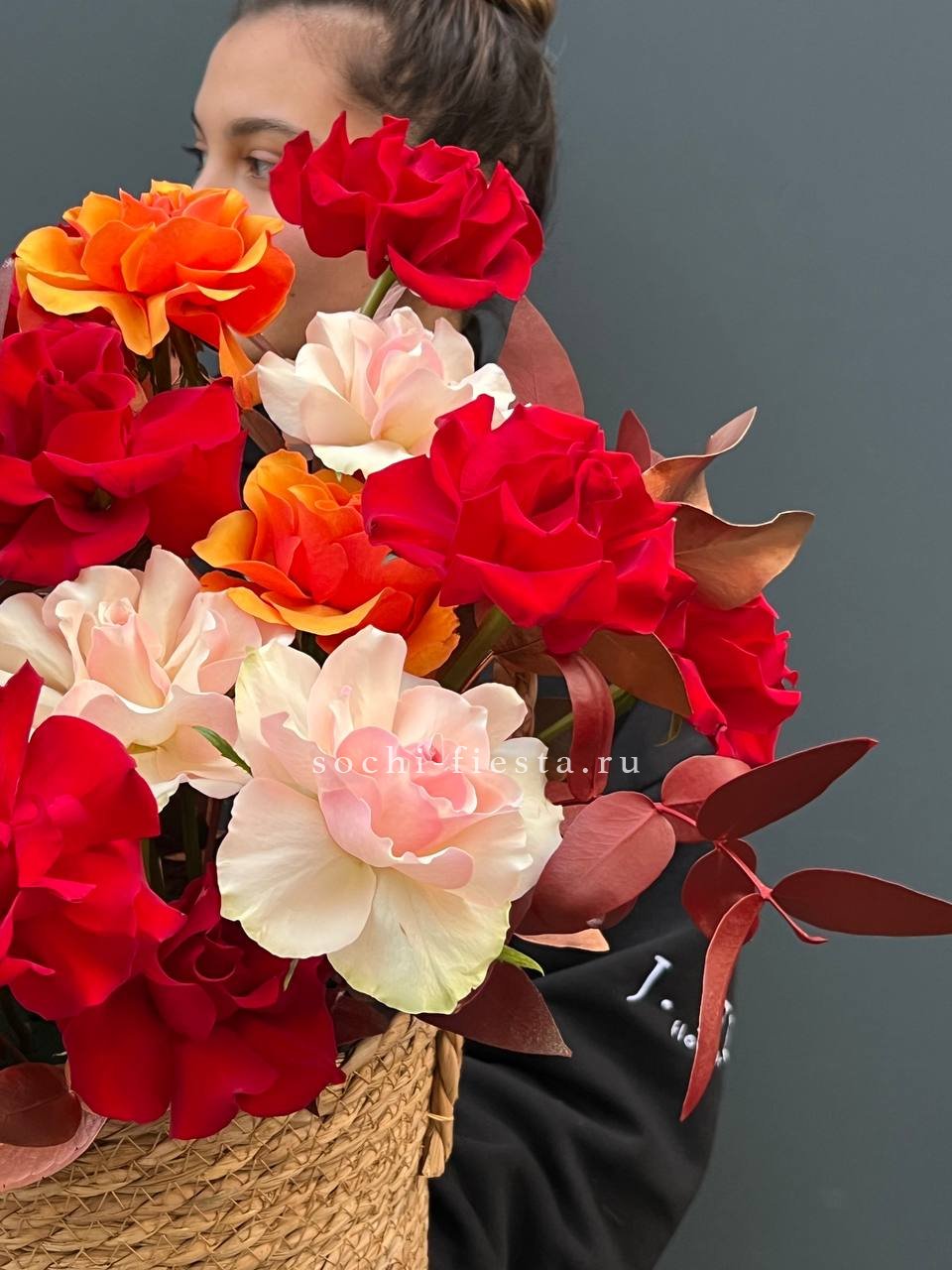 французские розы, эвкалипт, кашпо.