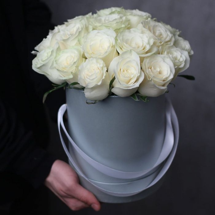 Французские розы собраны в плотную округлую форму и дополнены серебристыми ветками эвкалипта. Натуральное джутовое кашпо придает композиции естественность и законченность.