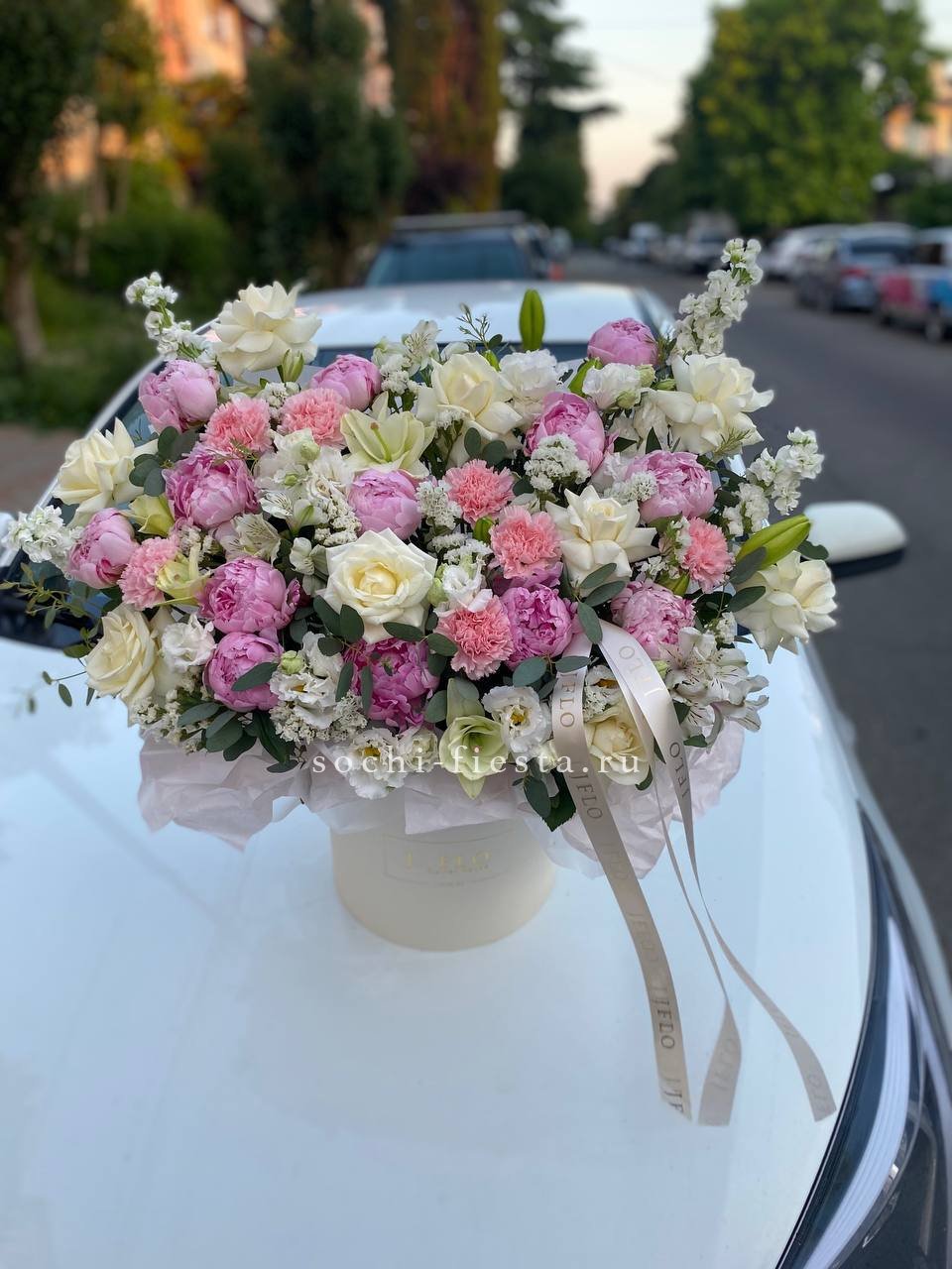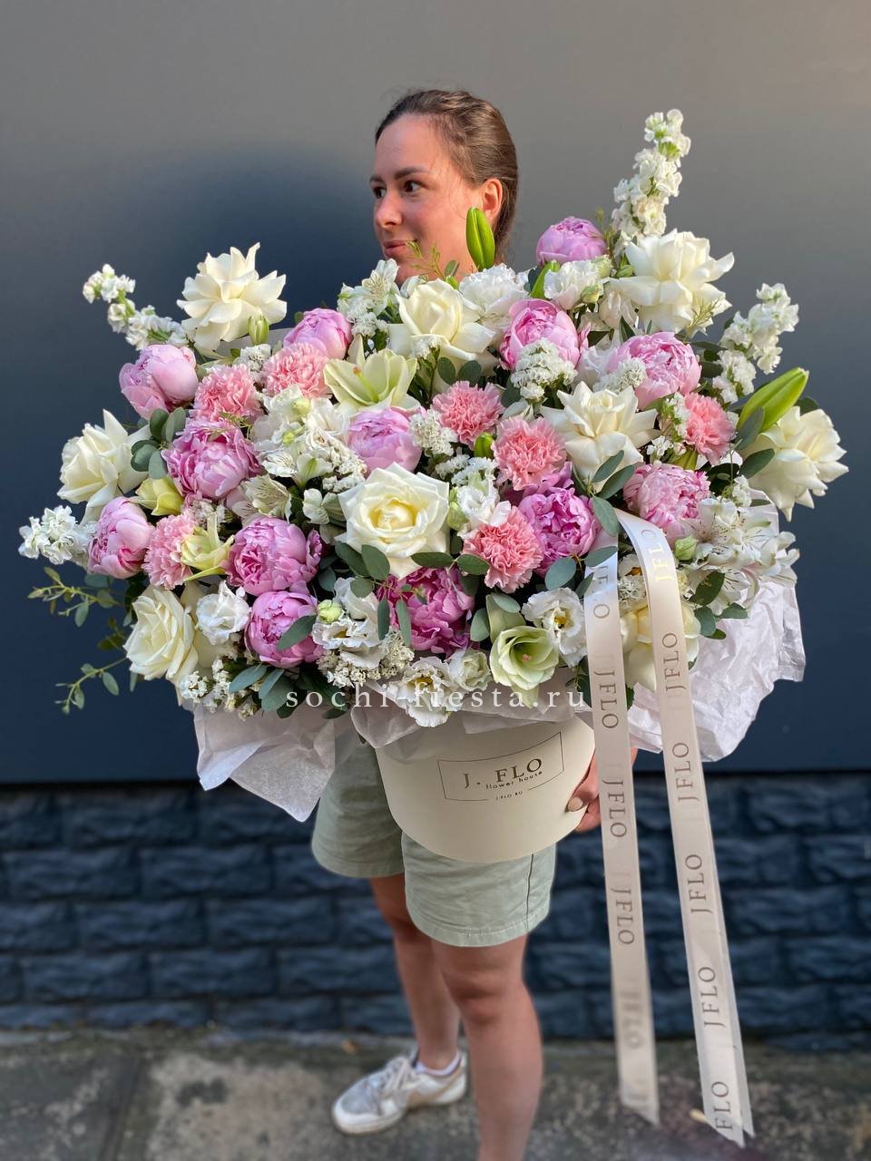 Воздушная композиция в пастельной гамме с акцентом на фактуру раскрытых бутонов. Пионовидные розы и эустома создают объёмный силуэт, а хлопок добавляет графичности.