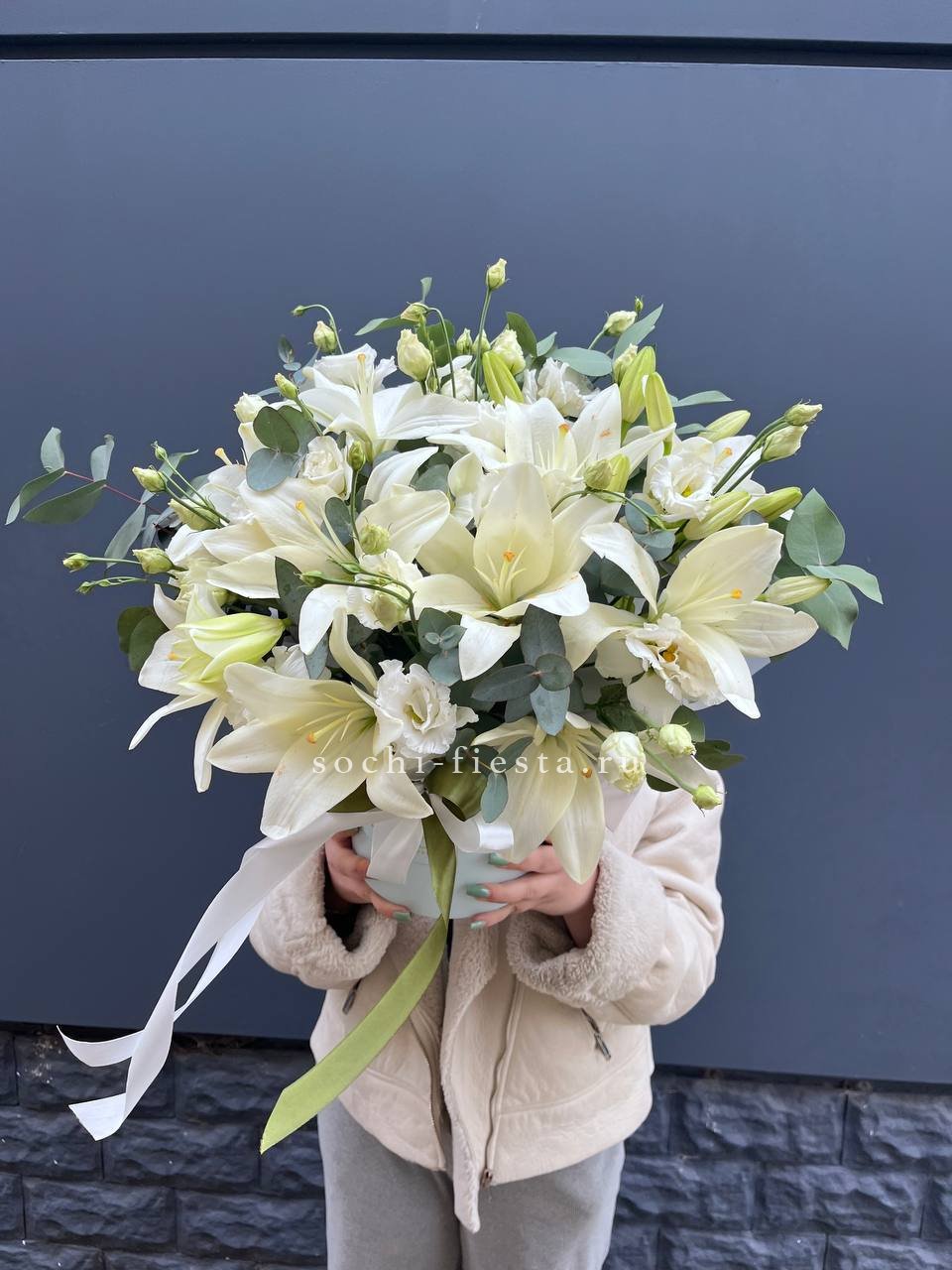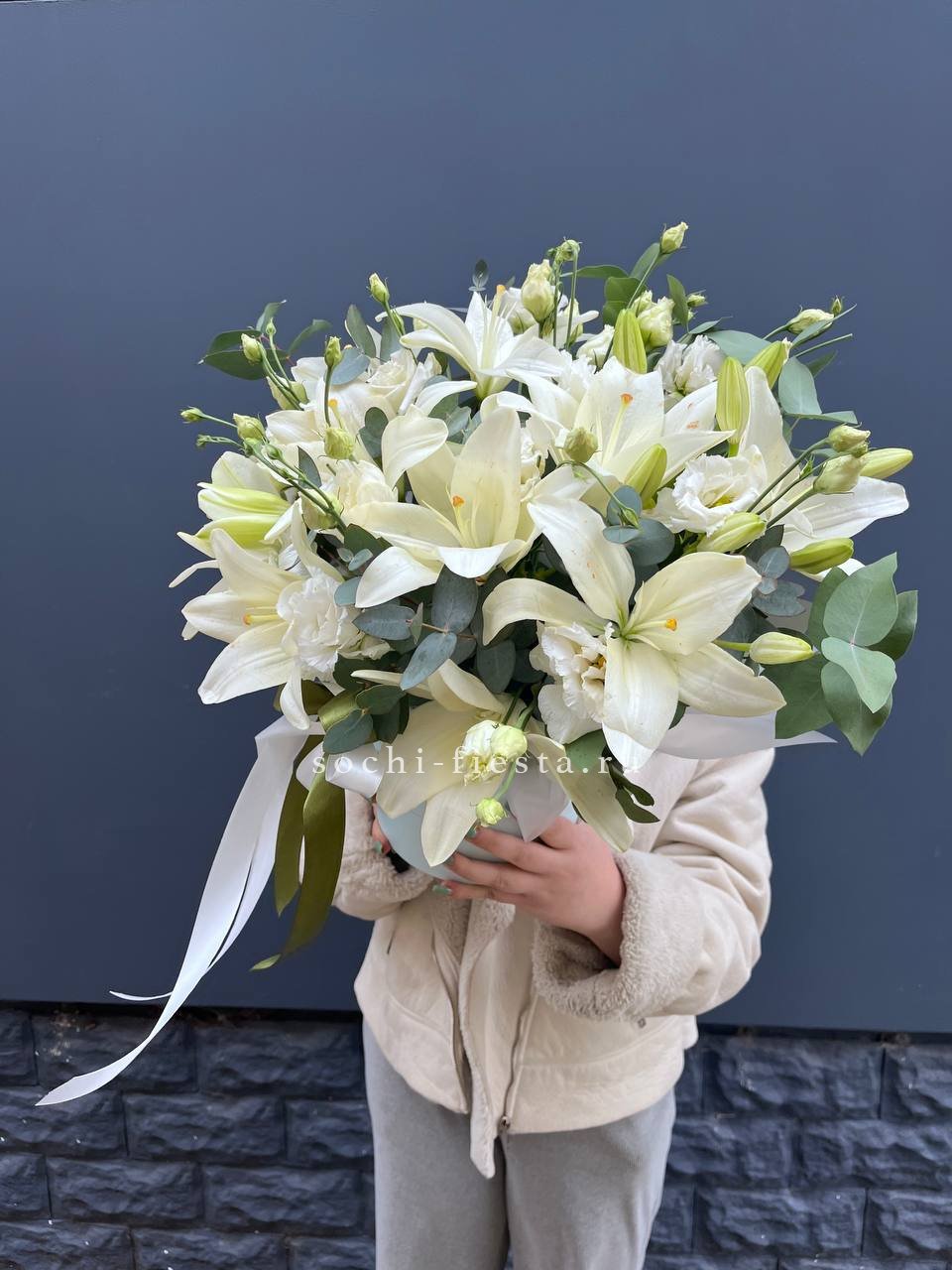 эустома, пионовидная кустовая роза, белая роза, хлопок, эвкалипт, бокс 13.