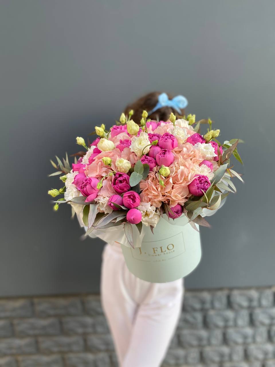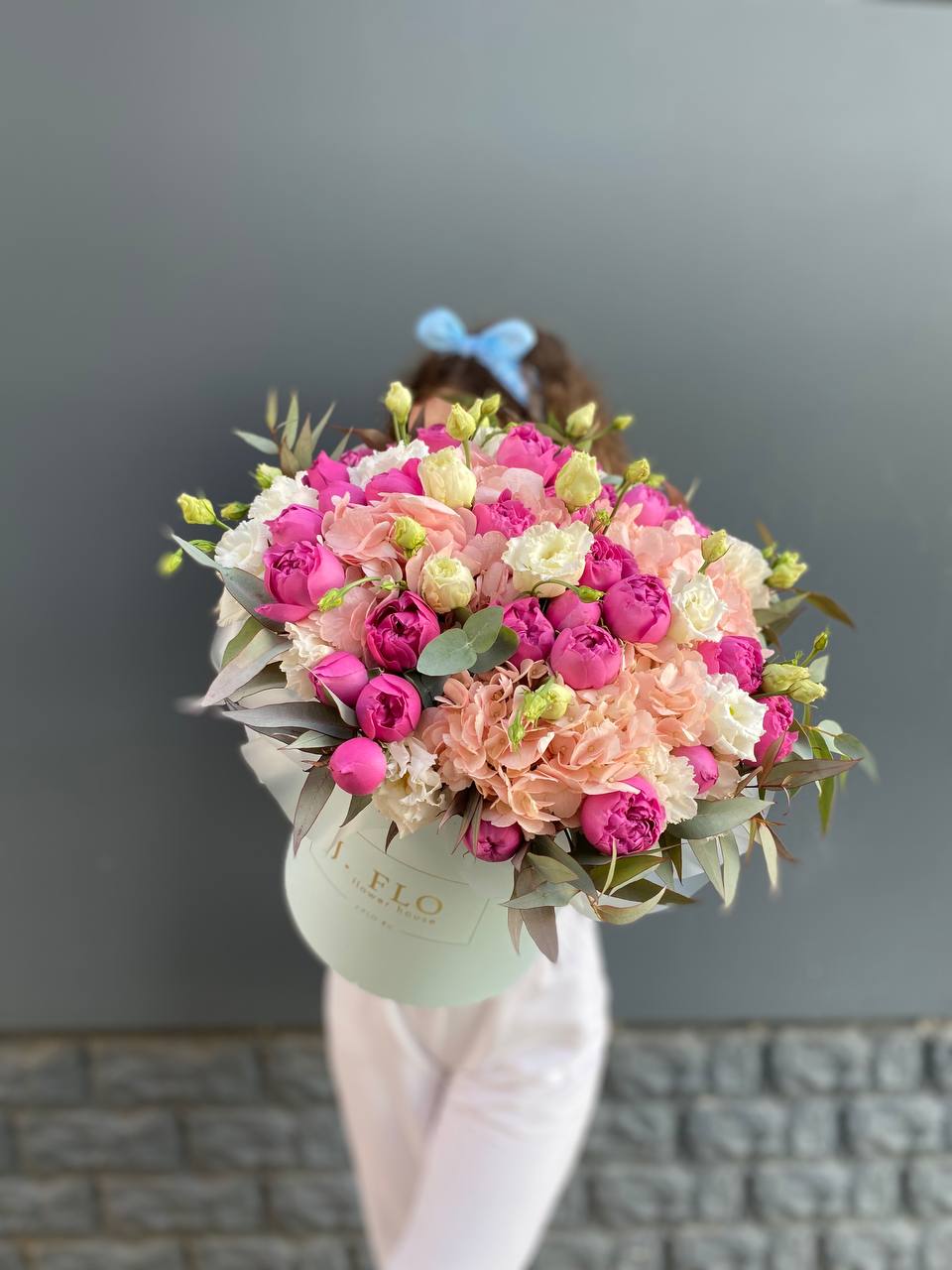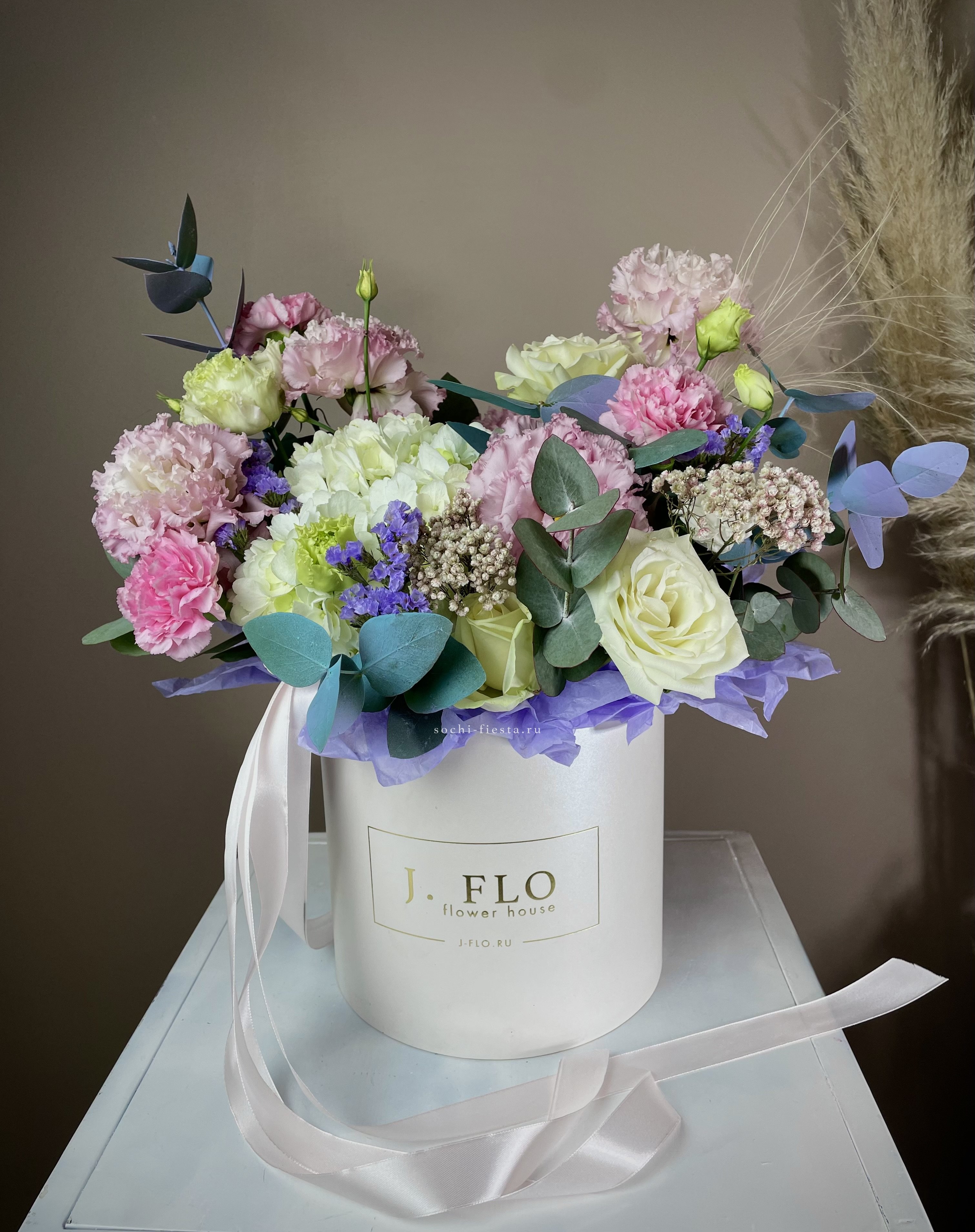 гортензии, эустома, розы, бомбастик, эвкалипт, антиринум в боксе 25.