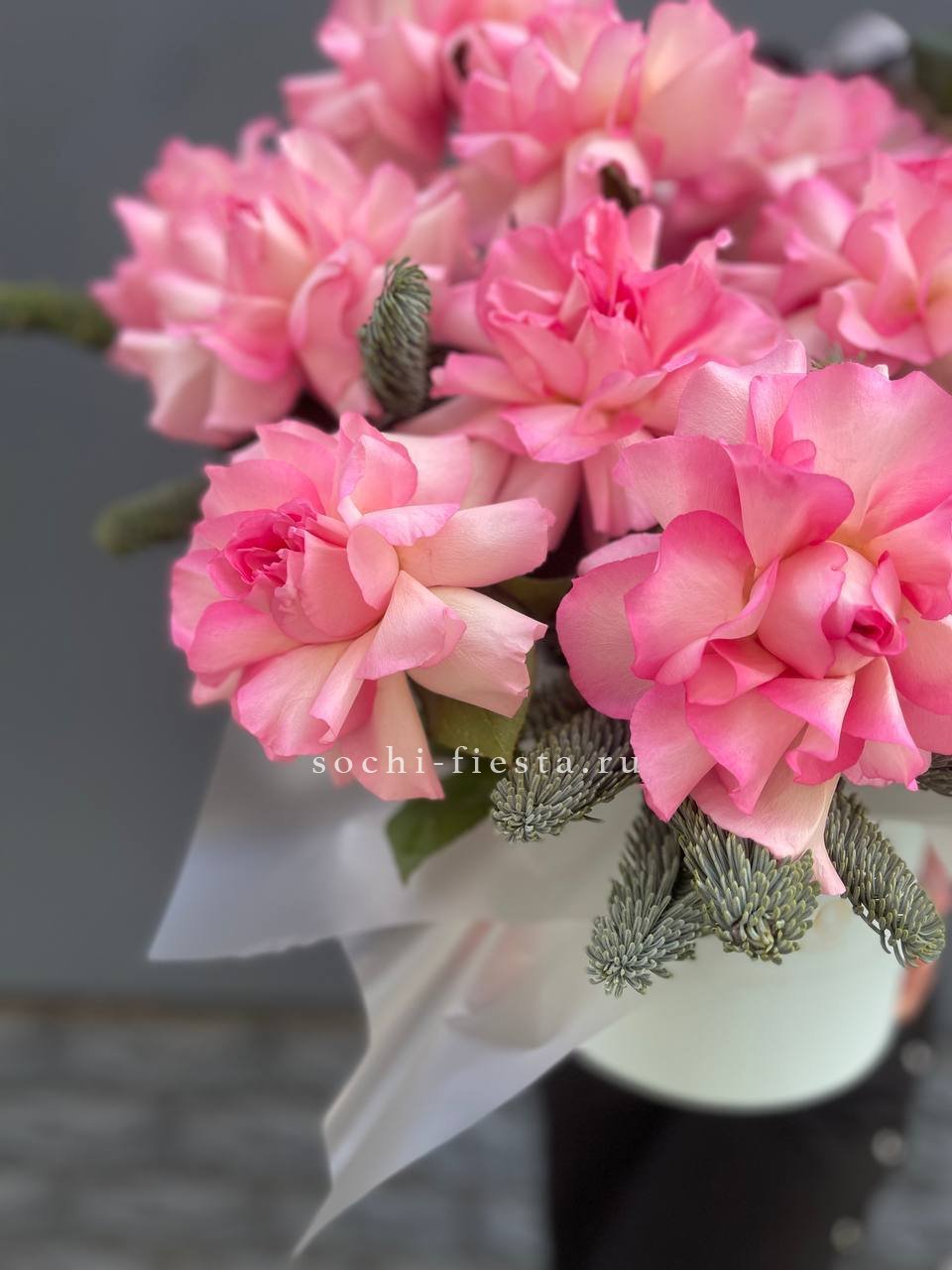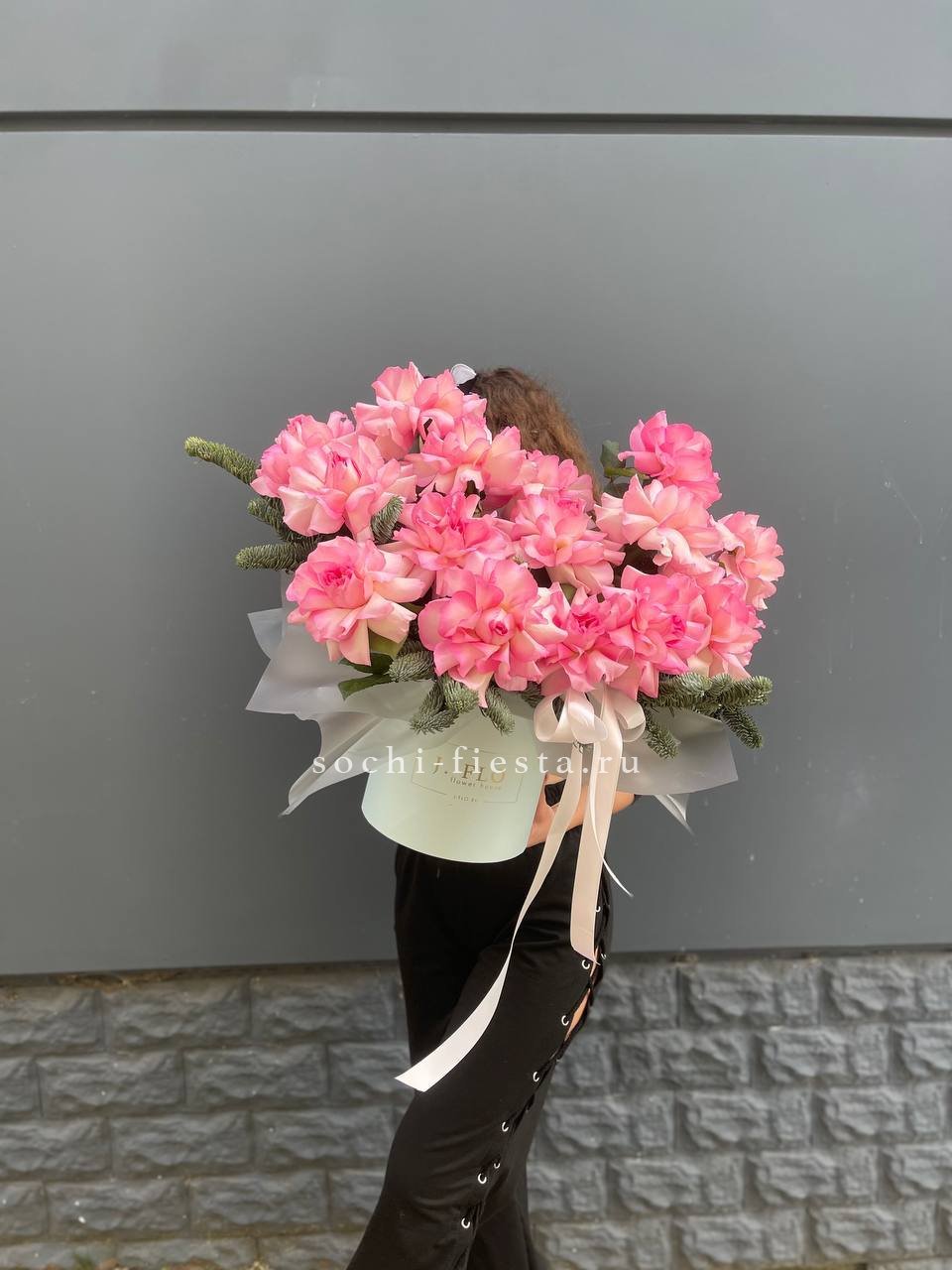 Пятнадцать роз Мандала в боксе образуют плотную шапку с густыми многослойными бутонами. Нобилис добавляет фактурную глубину и завершает композицию.