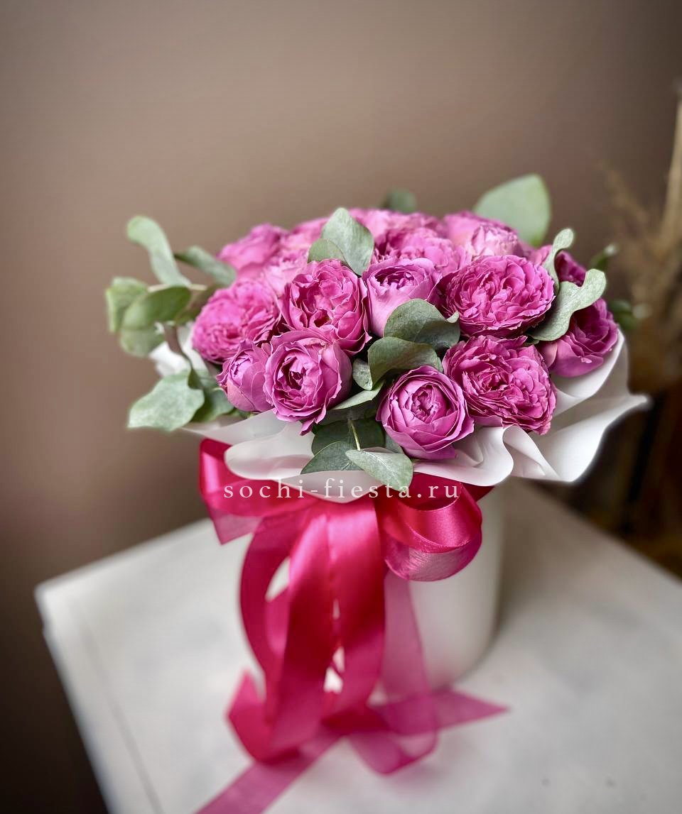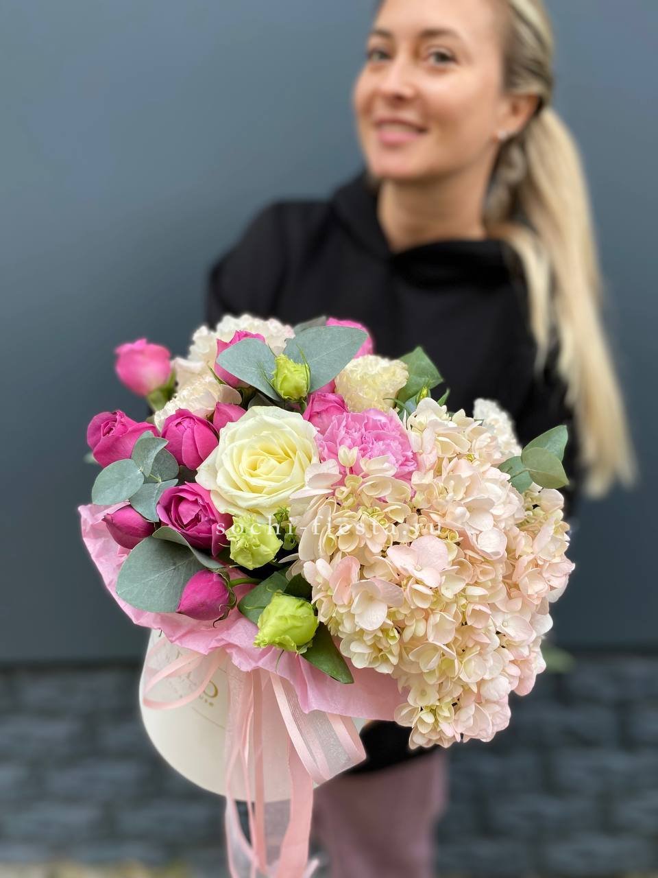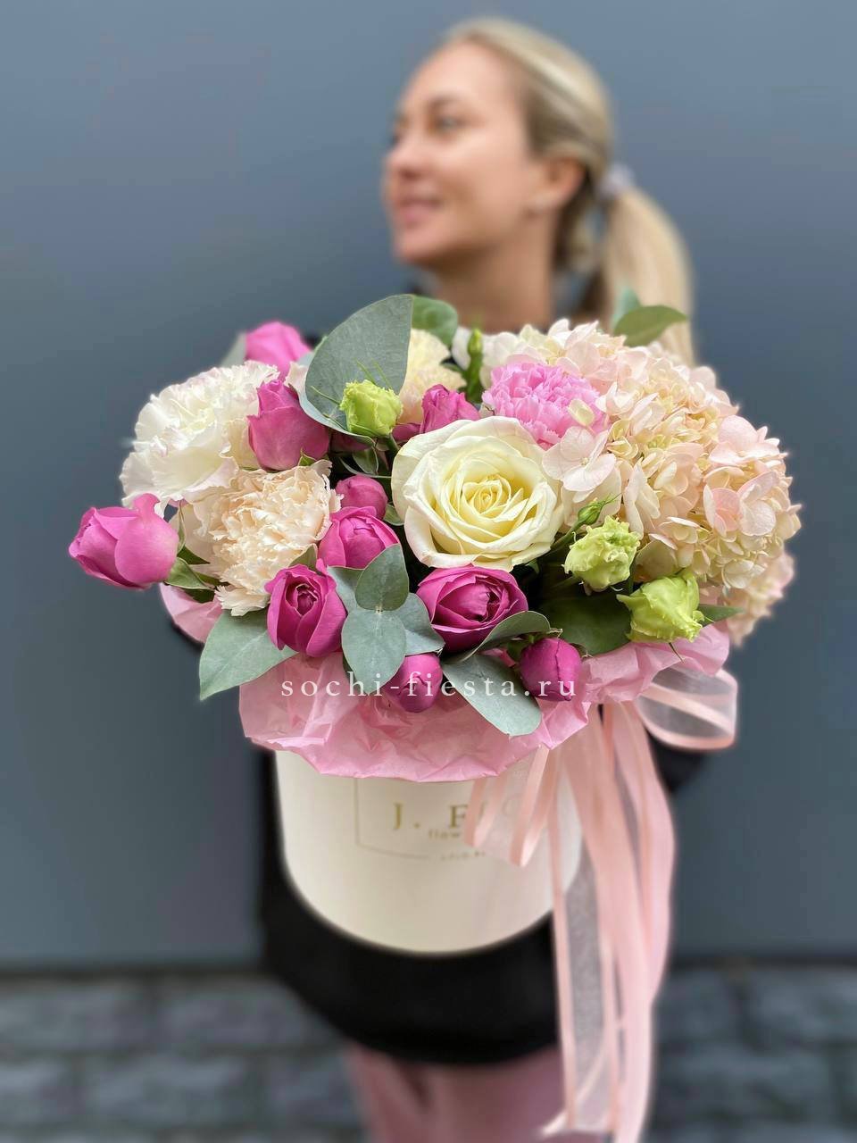Композиция в коробке объединяет пышную гортензию, воздушную эустому и кустовые розы, Джумилию с яркими гербами и хлопком. Плотное заполнение создает округлую форму, где каждый цветок находит свое место без пустот.