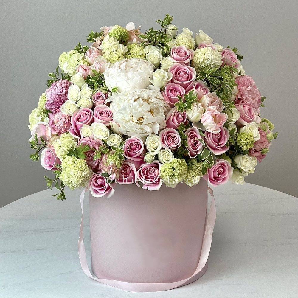 пионовидная роза сорта Мисти бабблс, эвкалипт в коробке или корзине.
