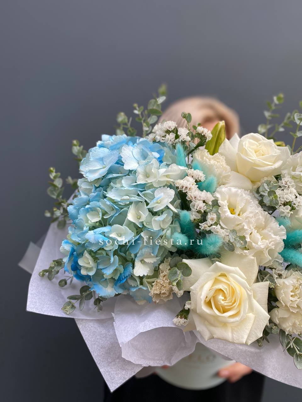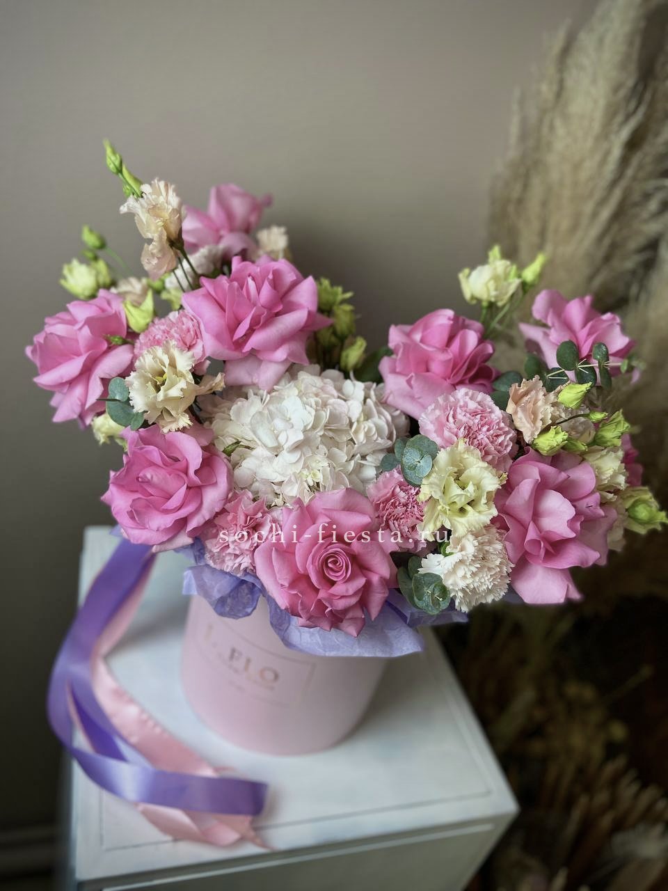 Белоснежная гамма раскрывается через лилии, розы и пышную гортензию с добавлением диантуса. Эвкалипт придает объём и глубину всей композиции в цилиндре.