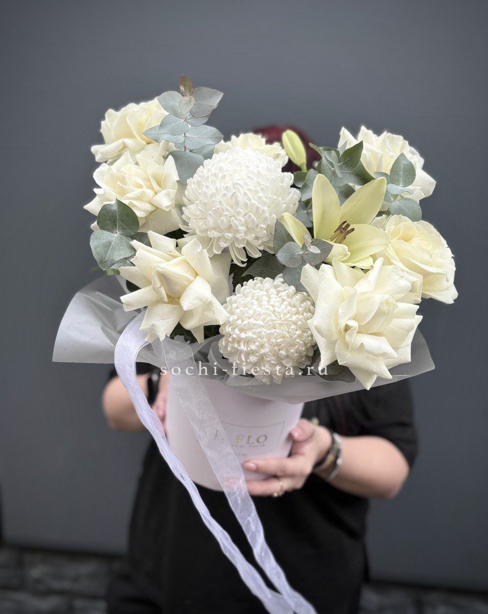 Белые розы и лилии раскрываются на фоне пушистых хризантем. Эвкалипт обрамляет композицию мягкими серебристыми ветвями. Светлая гамма создает ощущение свежести и простора.