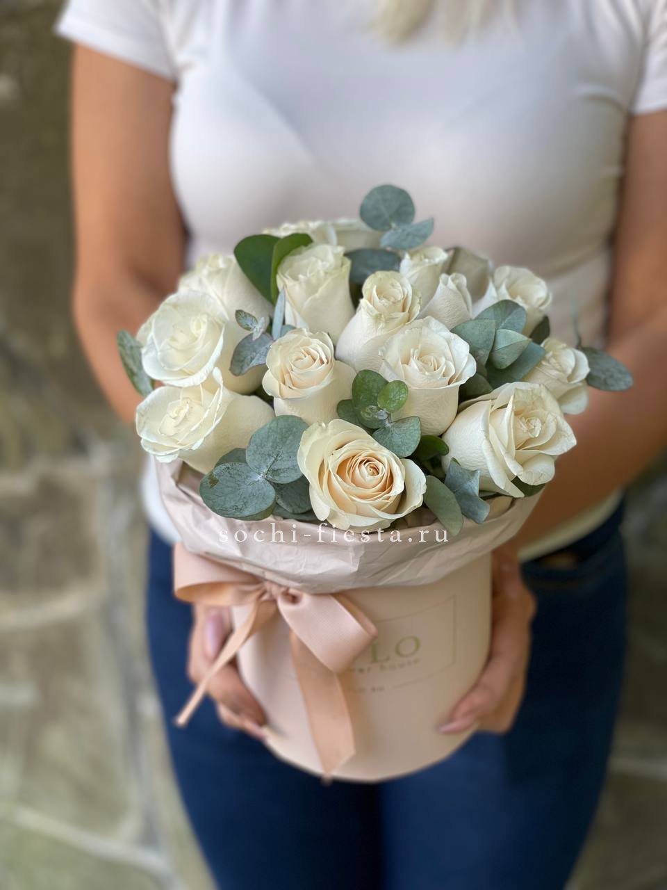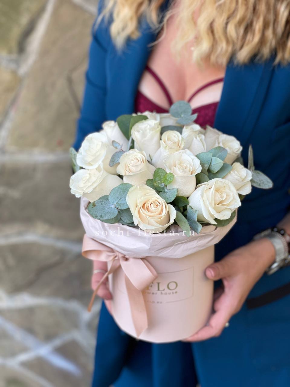 пионовидная кустовая роза, хлопок, одноголовая роза, кустовая хризантема, ковыль(стифа), эвкалипт, бокс D25.