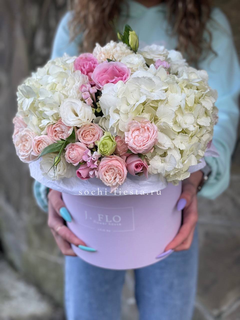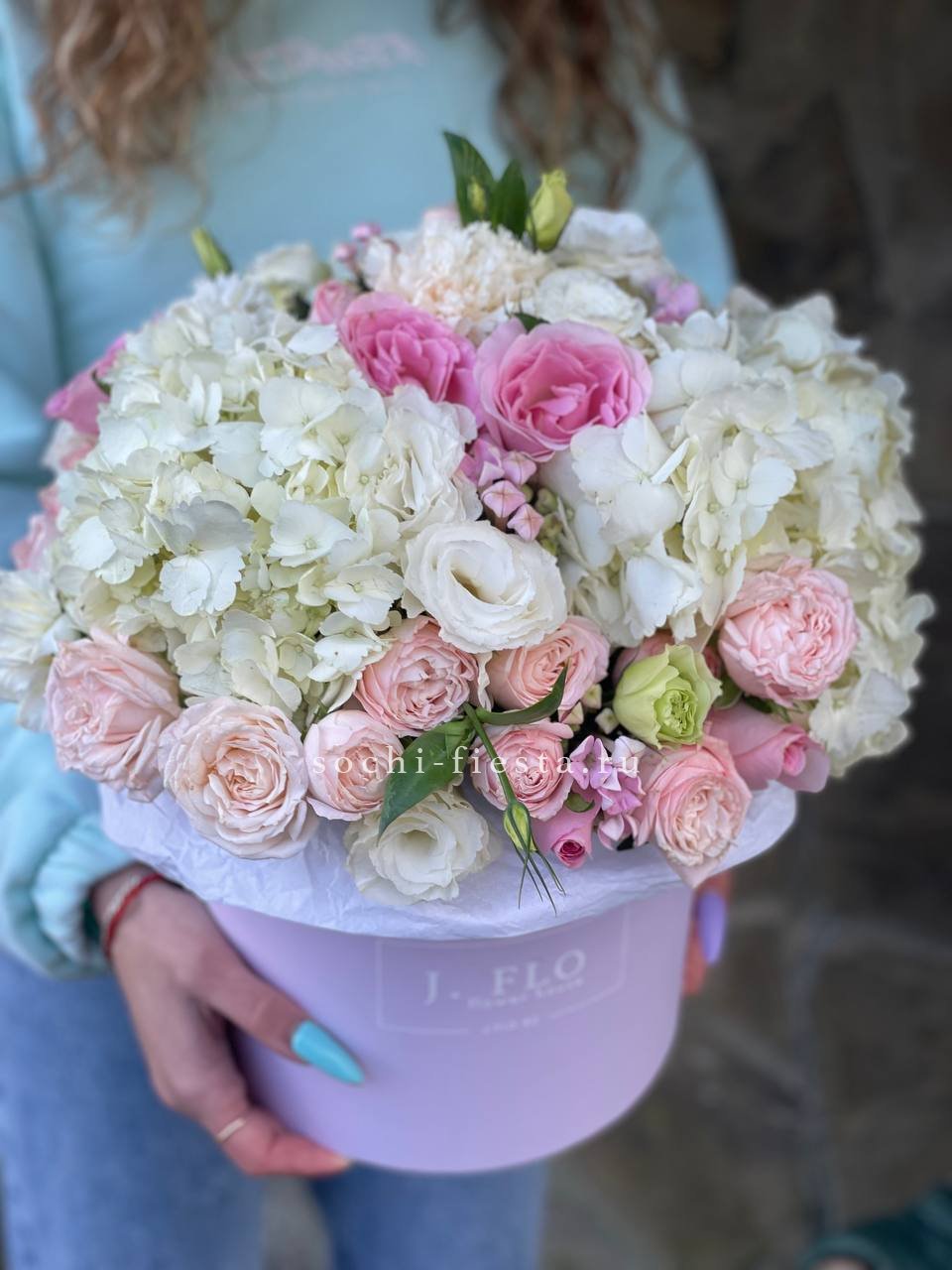Пионовидные бутоны и шапки гортензии заполняют бокс густой textured массой. Композиция держит форму и создаёт ощущение цветочной волны в ограниченном пространстве.