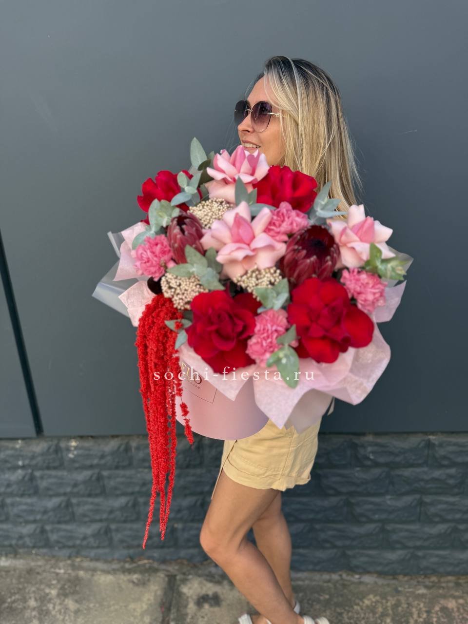 Французские розы и маттиола задают романтичный тон, а амарантус спускается мягкими каскадами за пределы бокса. Перья вносят графичную легкость в общую картину.