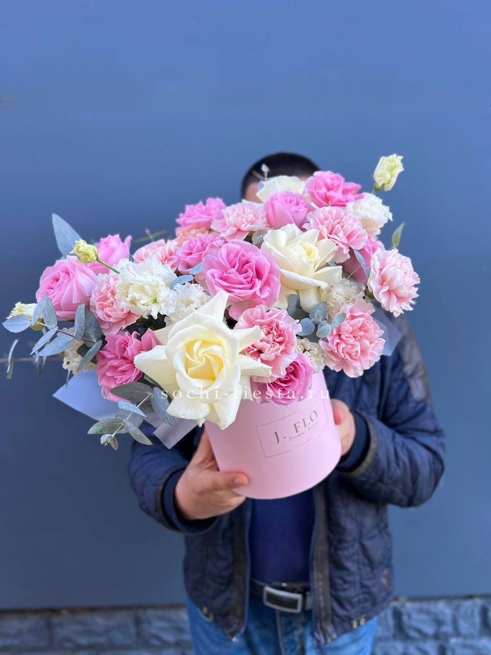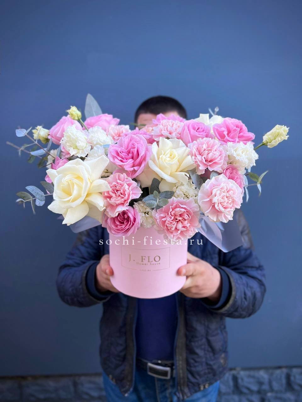 Гортензия создает пышную основу для французских роз и диантусов с эустомой. Цилиндр компактен и не требует дополнительной вазы. Розовая гамма раскрывается слоями от бледных до насыщенных оттенков.