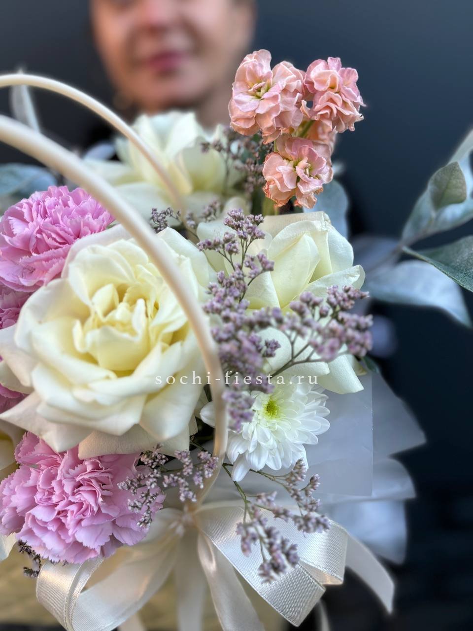 Розовые розы встречаются с орхидеей цимбидиум в объемной сумке-кашпо. Эустома и диантус создают многослойность, а кустовые розы заполняют пространство между крупными бутонами. Композиция держит форму и радует насыщенностью.