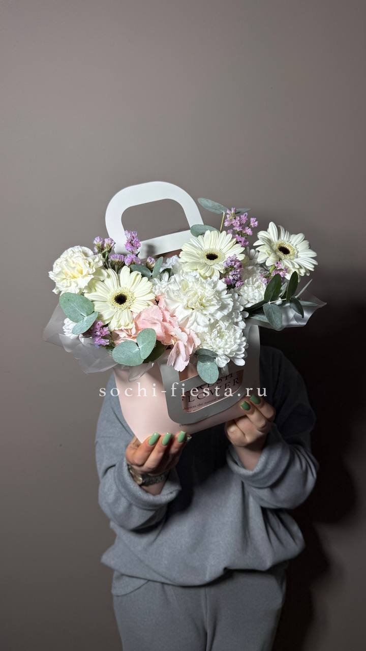 Голубая хризантема в компании воздушного лагуруса напоминает о прохладе летнего утра. Компактная форма в сумочке позволяет разместить цветы на столе или полке без лишних усилий.
