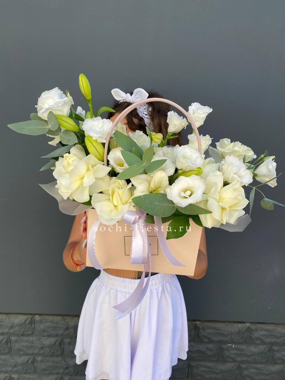 Белые и розовые розы образуют воздушную композицию с мягкими коробочками хлопка и лимониумом. Сумка-кашпо Sofi держит форму и позволяет разместить цветы на столе или полке. Букет выглядит аккуратно и остается свежим долгое время.