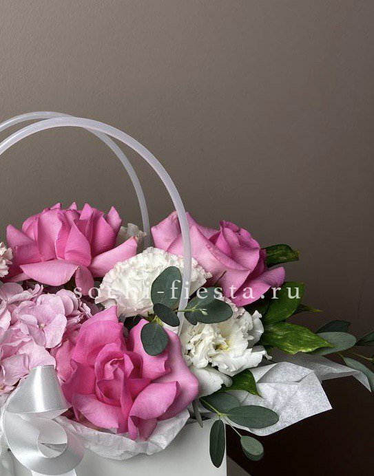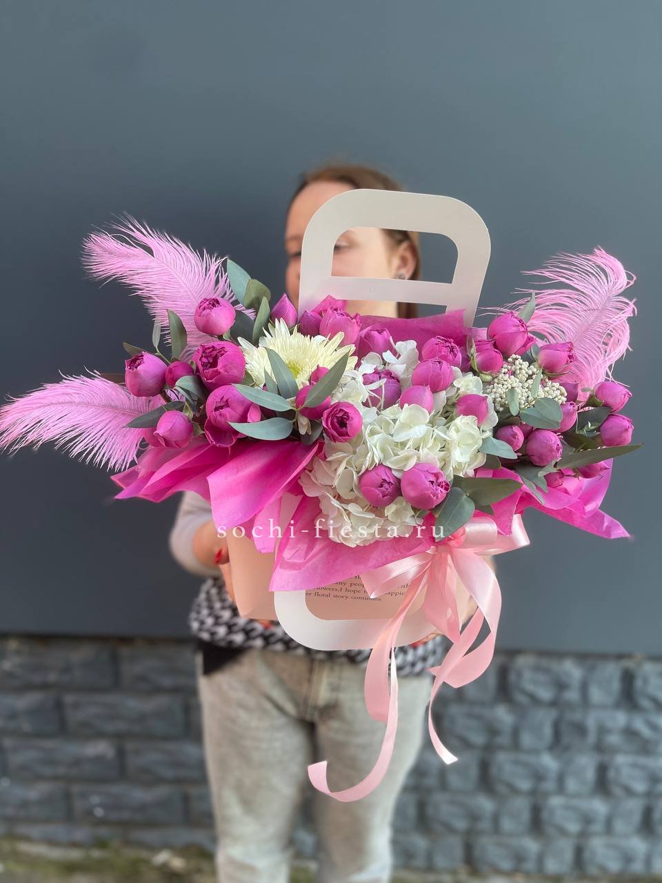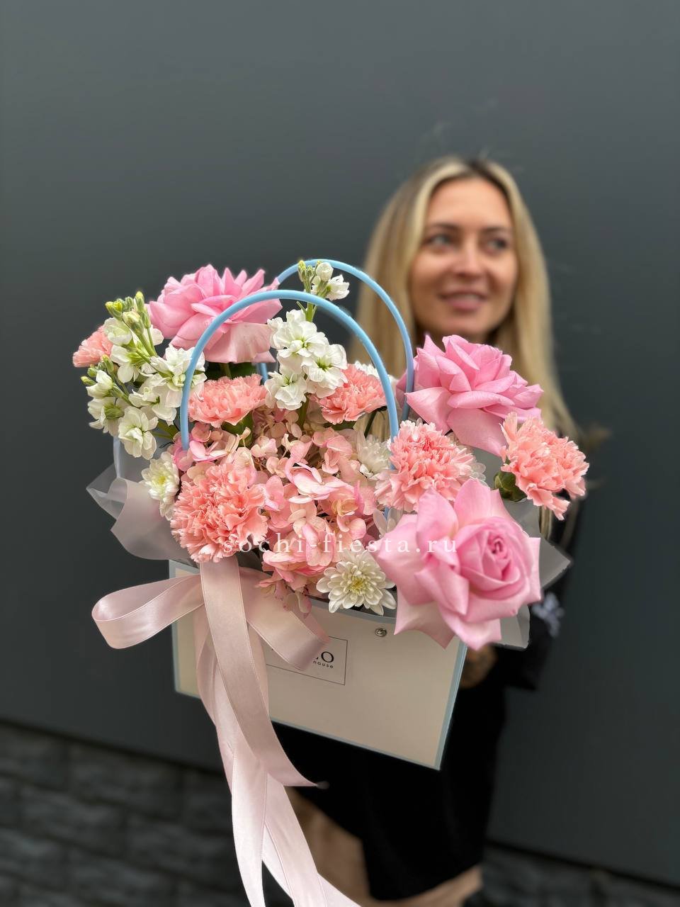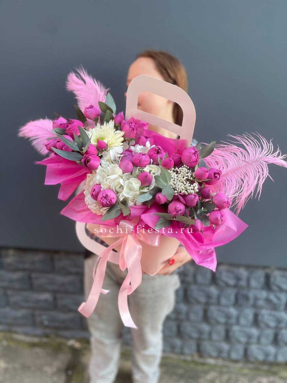 Розовые розы и диантусы переплетаются с кустовыми хризантемами в плотной округлой композиции. Альстромерия добавляет графичные акценты между бутонами. Сумочка собирает все элементы в аккуратную форму с естественным объёмом.