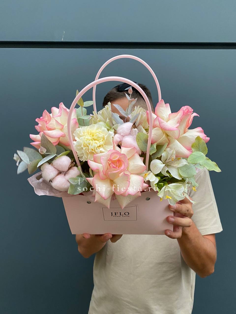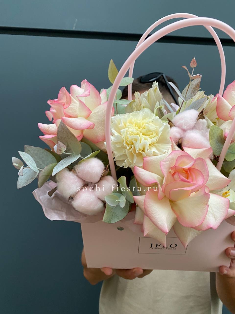 Воплощение изысканности и тренда! Эта стильная композиция в розовой сумочке объединяет в себе яркие цветовые акценты и современный флористический дизайн. Она идеально подойдет для модного образа или в качестве креативного подарка для ценителей необычных решений. Безупречный вкус в каждой детали.