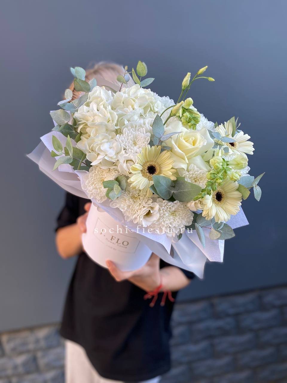 Пышная композиция в округлом боксе собрана из соцветий разной формы и ритма. Гортензия создает объемную базу, герберы и розы задают яркие точки, а эустома добавляет воздушности.