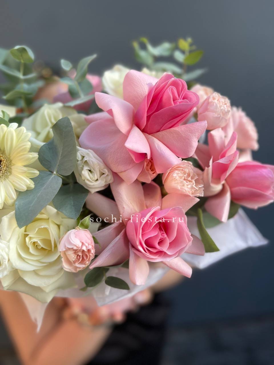 гербера, розовая роза, бомбастик, белая роза, эустома, бокс 13.